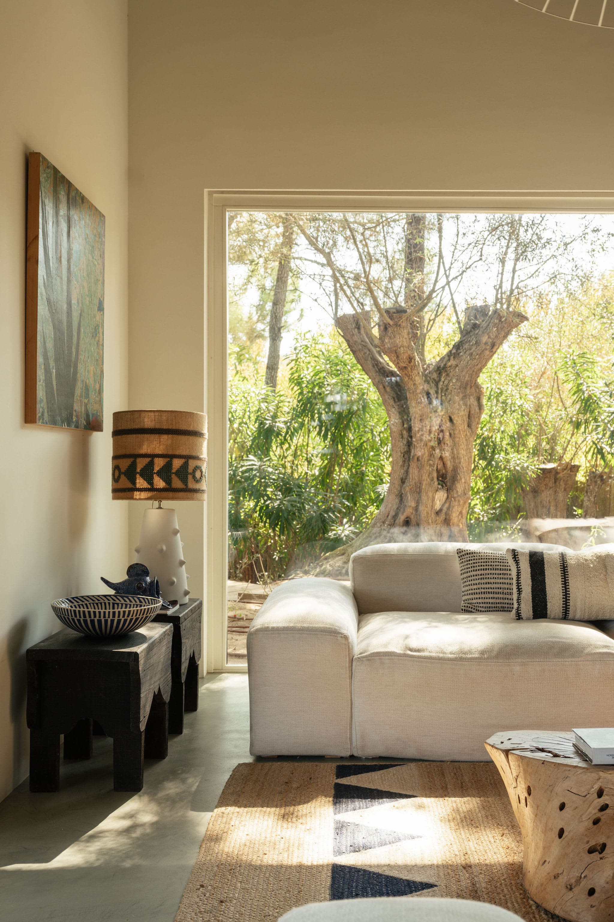 The landscaping reflects the natural character of the area, with white sandy pathways, more than ten types of lavender, and fourteen century-old olive trees shaping the garden. Existing pine trees were carefully preserved to minimise intervention and maintain a sense of privacy and continuity with the surrounding forest.