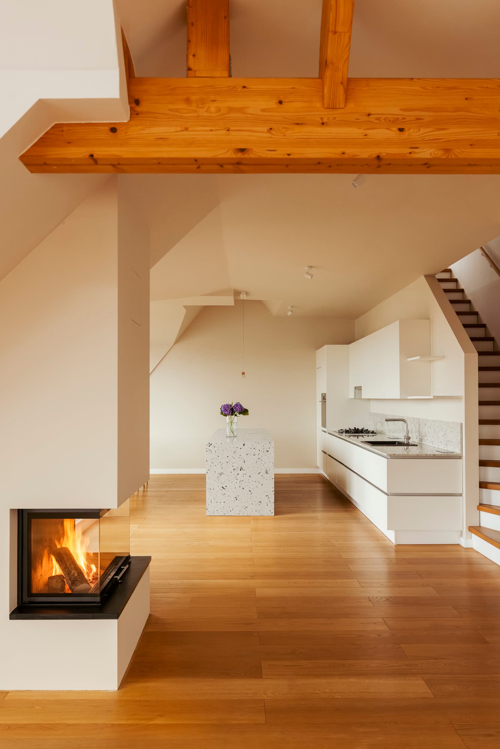 Die Dachgeschosswohnung in der Driesener Straße verbindet architektonische Großzügigkeit mit feiner handwerklicher Präzision. Der lichtdurchflutete Wohnbereich mit bis zu vier Meter hohen Decken, Kuppeldach und Kamin bildet das Herzstück. Großzügige dreifach verglaste Holz-Alu-Fenster öffnen den Blick über die Dächer von Prenzlauer Berg, während warmes Eichenholzparkett und die klare Geometrie des Raums eine ruhige, elegante Atmosphäre schaffen. Die offene Küche mit maßgefertigten Mondo-Möbeln, zentraler Insel, und hellen Marmorarbeitsflächen fügt sich nahtlos in das Raumkonzept ein; eine Treppe führt direkt hinauf auf die private Dachterrasse, ein seltener Rückzugsort mit weitem Blick über die Stadt.