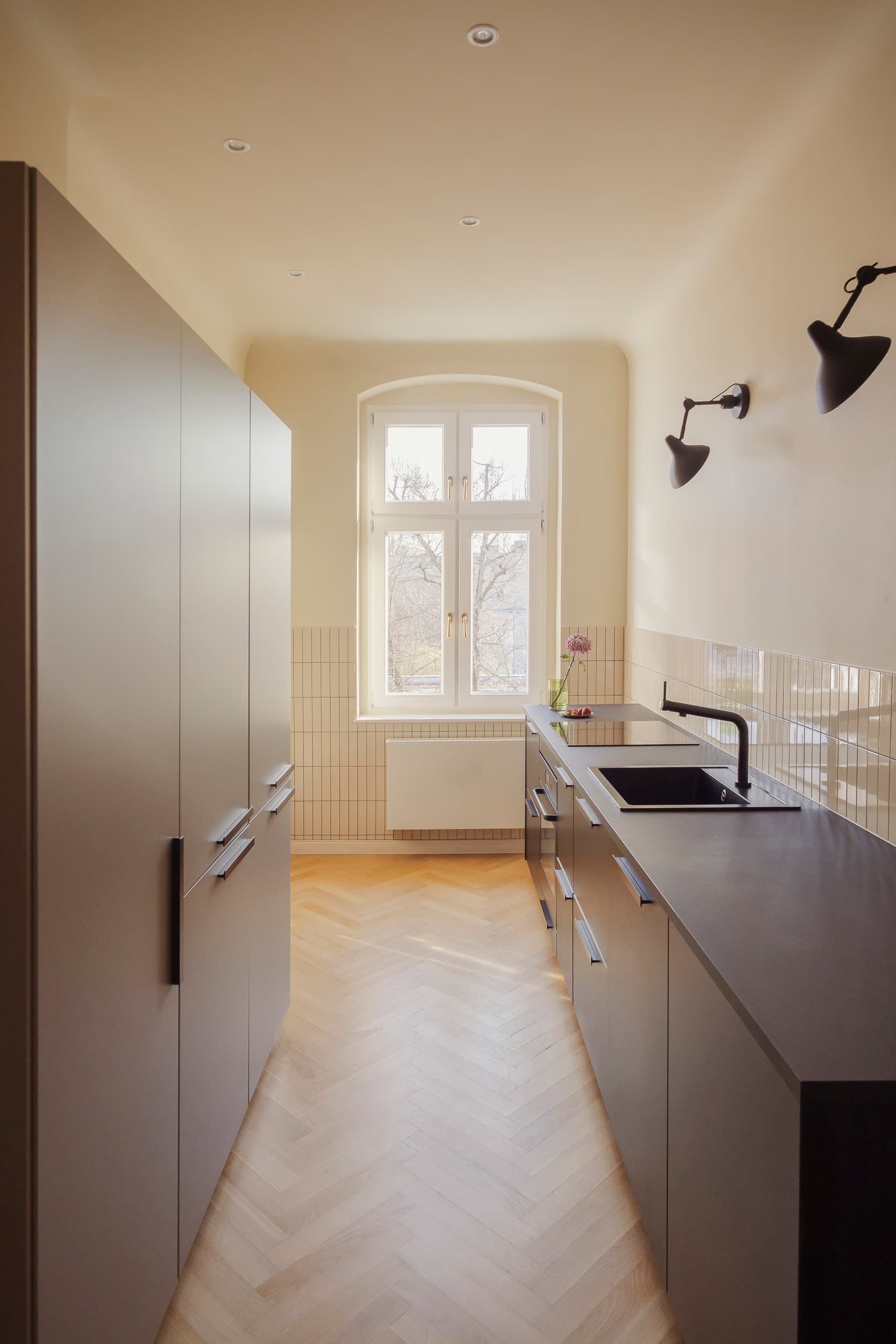 Die Küche ist als eigenständiger Raum gestaltet. Eine matt-schwarze Einbauküche bildet eine klare, reduzierte Linie und kontrastiert bewusst mit dem warmen Holz des Parketts, ergänzt durch vertikale Fliesen von Plum. Das Bad ist als Tageslichtbad mit Wanne ausgeführt und wird durch eine Fußbodenheizung ergänzt.