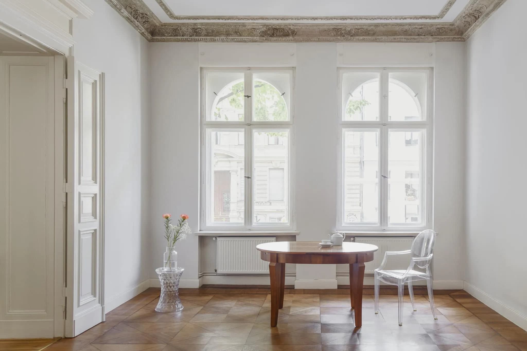 Sämtliche Wände sind glatt verputzt und weiß angelegt, genauso wie die Türen mit den reich verzierten Türgewänden und den Fenstern mit den Sprossen und Fensterbänken. Ein helles, zartes Beige tritt bei den Fronten der Küchenzeile der italienischen Edelmarke Strato, beim Stuck und dem Naturstein Travertin in Erscheinung. Diese Reduzierung auf Weiß, Beigetöne und Brauntöne, durch das Holz der Böden, betonen die vielfältige und abwechslungsreiche Formsprache dieser Jahrhundertwendearchitektur (1900). Nobel, repräsentativ, traditionsbewusst lautet hier das Credo für das Wohnen in solchen Gebäuden.