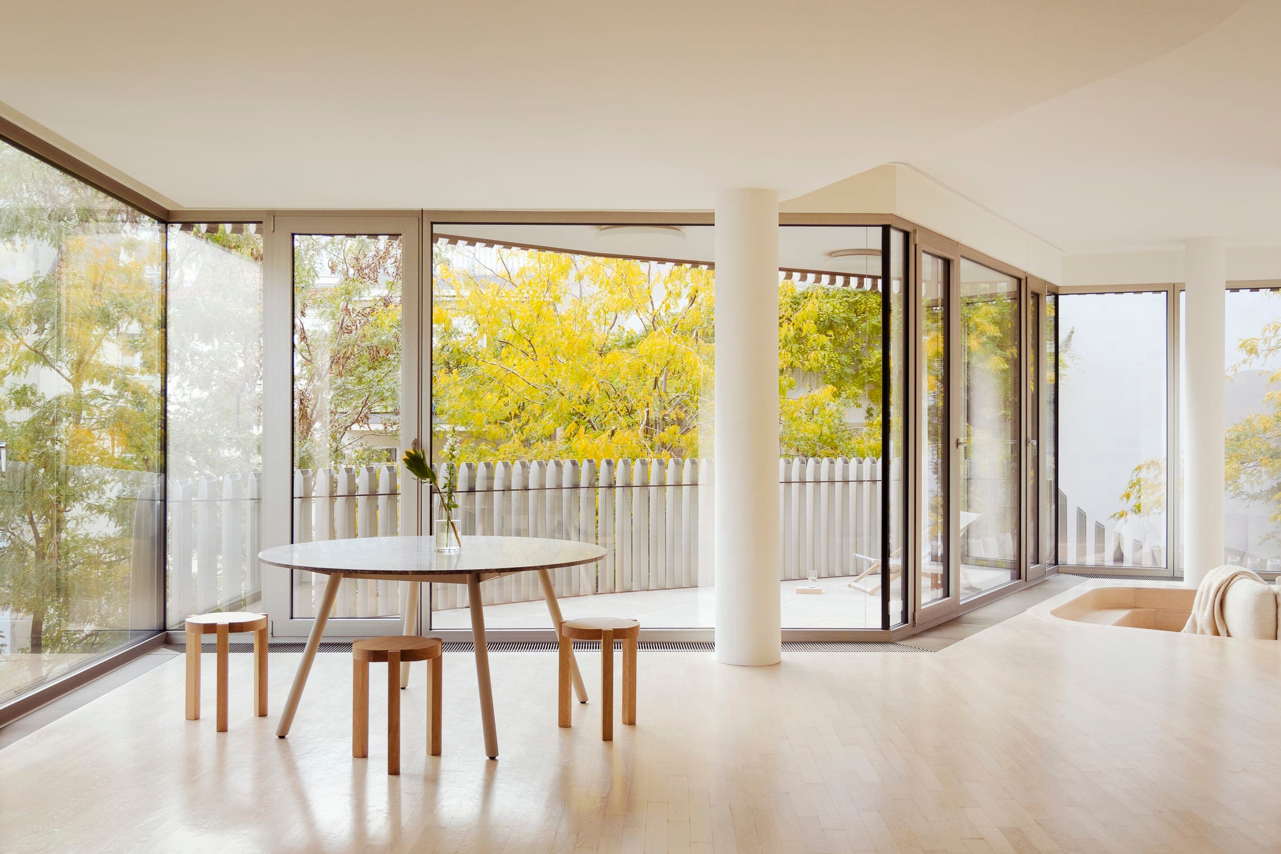 Dieser hohe gestalterische Anspruch setzt sich im gesamten Ensemble fort. Ein ruhiger, sorgfältig angelegter Hofgarten und das markante, mit Bambus bepflanzte Atrium bilden einen grünen, kontemplativen Mittelpunkt und führen zum hinteren Gebäudeteil. Die beiden natürlich belichteten Treppenhäuser transportieren die skulpturale Formensprache ins Innere. Großzügige, fließende Übergänge ins Freie schaffen ein offenes Wohngefühl mitten in der Stadt, während die variierenden Höhen der einzelnen Baukörper für eine interessante Abfolge von Räumen und Blickbezügen sorgen.
