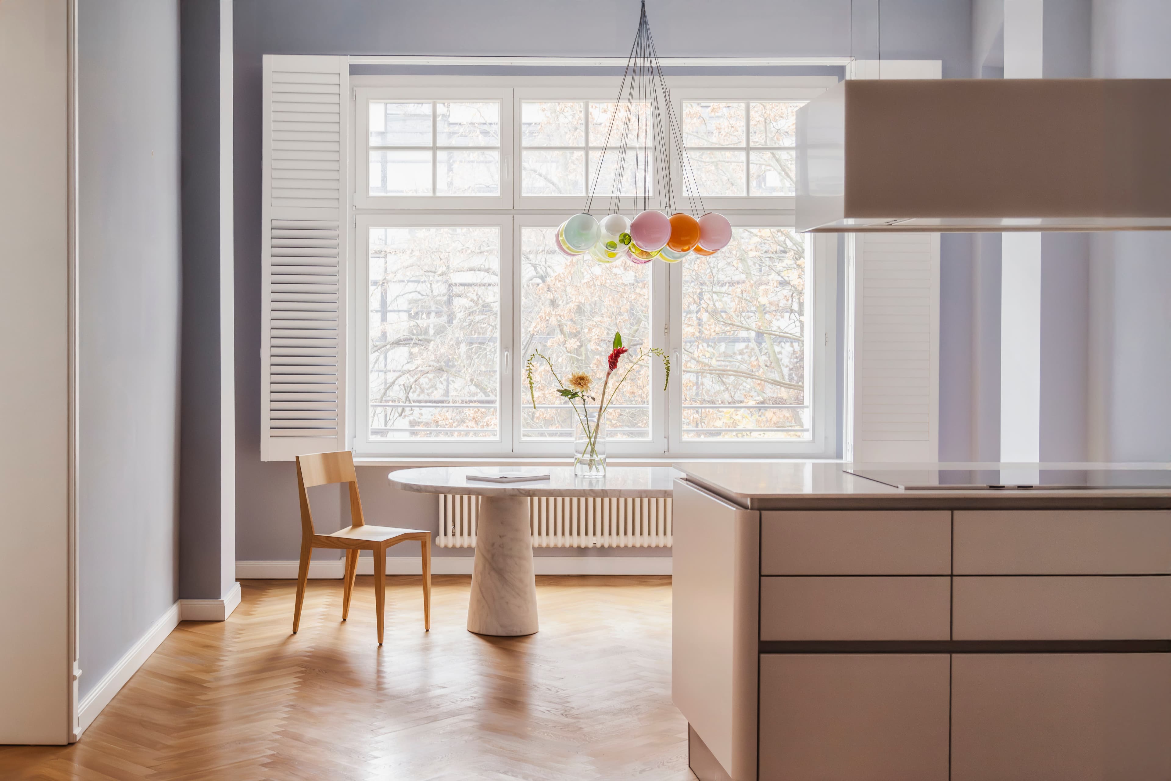 Straßenseitig liegen in südwestlicher Ausrichtung drei Zimmer, von denen zwei durch eine Doppelflügeltür miteinander verbunden sind, ein typisches Merkmal klassischer Berliner Altbauwohnungen. Das erste Zimmer rechts ist als Esszimmer mit offener Küche konzipiert. Die weiße Musterring-Einbauküche mit ihrer Corian-Arbeitsplatte ist zeitlos elegant und mit erstklassigen Elektro-Geräten von Miele und Neff ausgestattet. Der ovale weiße Marmoresstisch von Agapecasa und die darüber angebrachte Deckenleuchte von Bocci setzen zusätzliche moderne Akzente und befinden sich vor dem beeindruckend großen Fenster mit seiner klassischen Sprossenaufteilung.