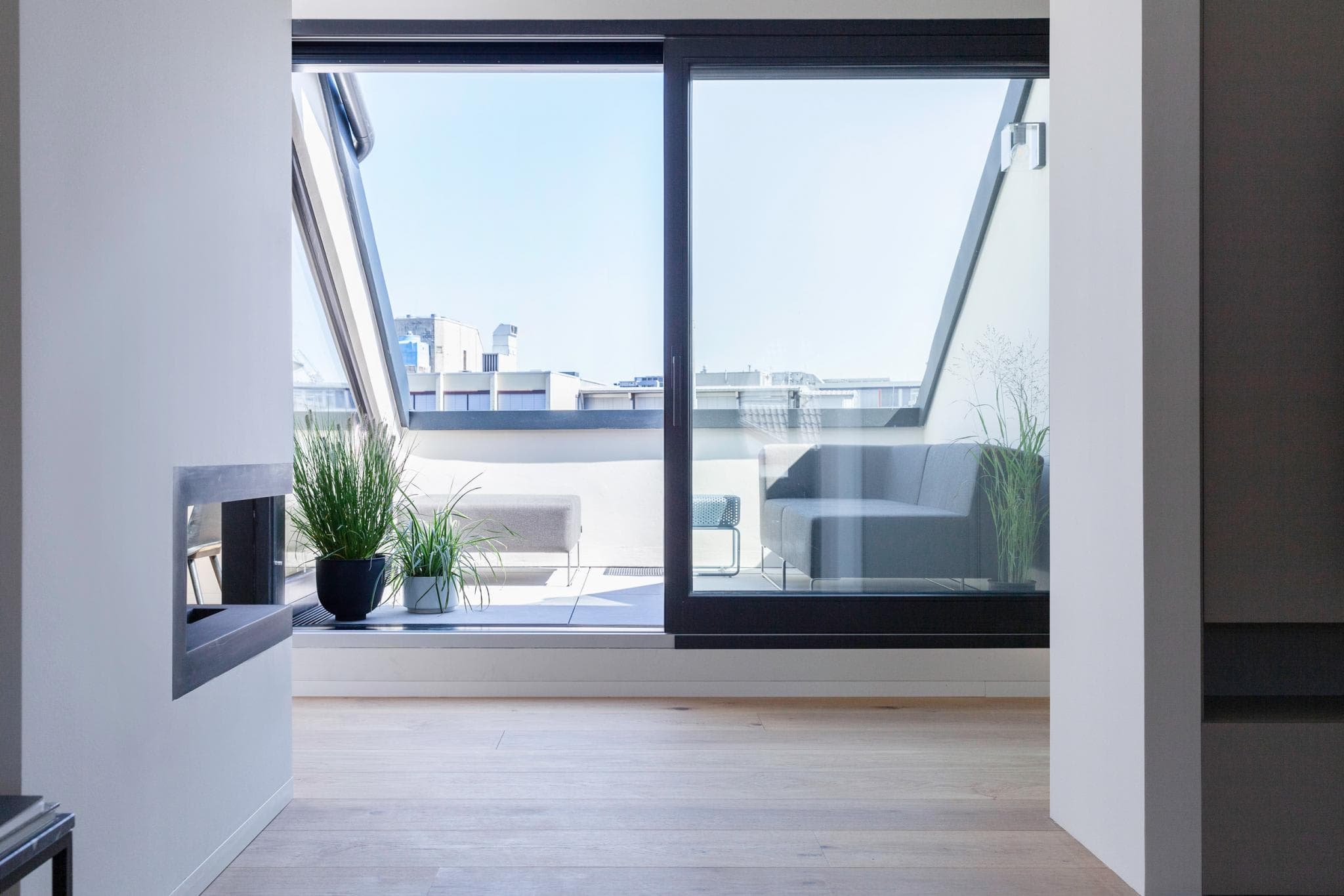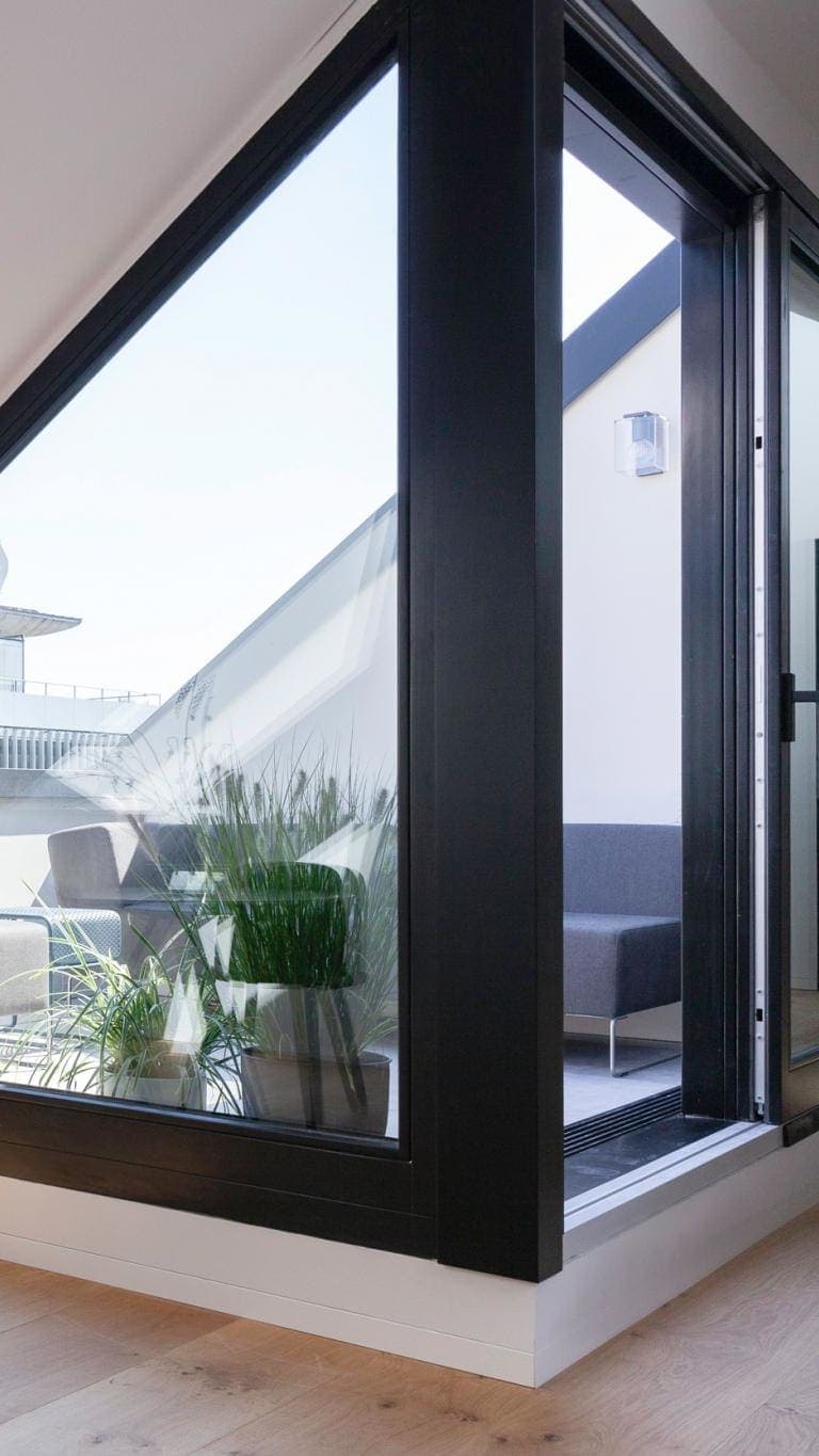 Durch die stylish in mattschwarz gehaltene Wohnungstür gelangt man in den hellen Flurbereich mit rahmenlosen Dachfenstern und hochwertigen Einbauten in matt-taupe. Von dort aus gelangt man in alle Räumlichkeiten wie das großzügige Schlafzimmer mit taupefarbenem Einbauschrank mit genügend Stauraum, angrenzend das Wellness Tageslichtbad mit Walk-In Dusche aus Travertin-Naturstein, mattschwarze Badarmaturen von Vola und ein Alape Waschbecken mit einem Unterschrank aus Eichenholz. Das (Gäste)-WC besitzt ebenfalls hochwertige Einbauten für Waschmaschine und Trockner.Der loftartige Wohnbereich überzeugt durch seine überhohen Decken mit klaren Linien und vermittelt ein großzügiges, urbanes Flair. Ein Raumteiler bzw. überdimensionaler Einbauschrank mit ausreichend Stauraum grenzt das Wohnzimmer vom Eingangsbereichs ab. Ein großzügiger Essbereich mit offener, mattschwarzer voll ausgestatteter Designerküche und stylischen Küchentower inklusive Küchengeräte von Franke und AEG bietet zusätzlich Platz für Dinners mit Freunden. Ein weiteres, architektonisches Highlight ist die große Sonnenterrasse mit Blick ins Grüne, die zum Verweilen einlädt.Zu den weiteren Ausstattungsmerkmalen zählen mattschwarze überhohe Zimmertüren, trittschallgedämmte Böden, Einbauschränke im Schlafzimmer, Wohnzimmer und Bädern, Elcom Video-Gegensprechanlage, einbruchssichere Wohnungstür, Fußbodenheizung, energieeffiziente Solar-Heizanlage, mattschwarzer Bioethanol-Kamin und Lichtkonzept in der gesamten Wohnung (hochwertige Einbauspots und Leuchten). Zusätzlich ist die komplette Inneneinrichtung inkl. Designer-Möbeln von Vitra, HAY, Gubi, FRAMA, E15, B&B Italia, Hübsch Furniture, OyOy, Áclm Studio, Muuto als Verhandlungsbasis vorhanden.