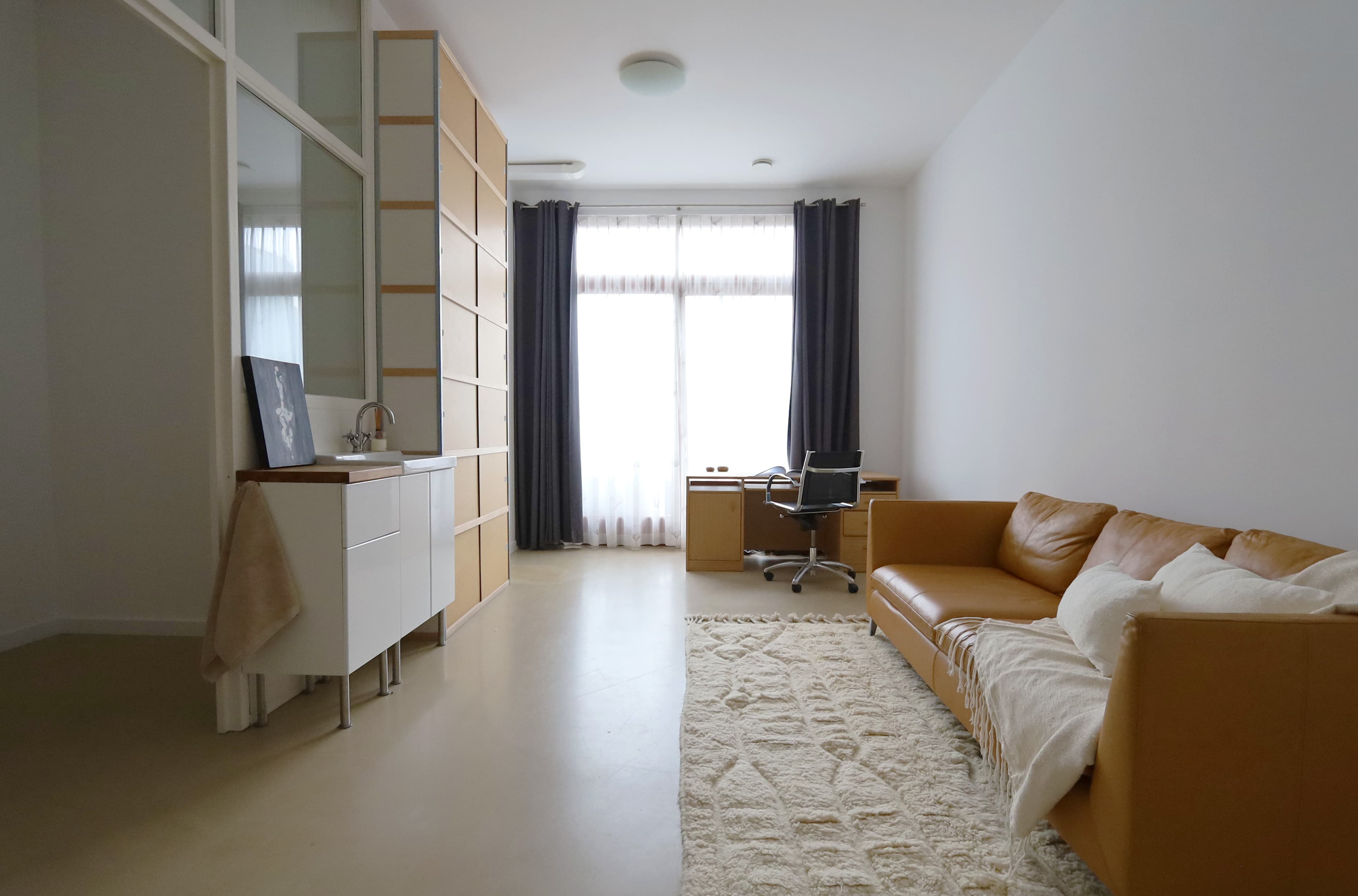 Entering through either of the two entrances, the home unfolds across three generous levels designed for flexible live-work living. The ground floor offers a bright, high-ceilinged studio space with its own private access, ideal for a practice, atelier, office, or guest accommodation. Two bedrooms open directly onto the large communal courtyard terrace, complemented by a full bathroom and a separate laundry room.