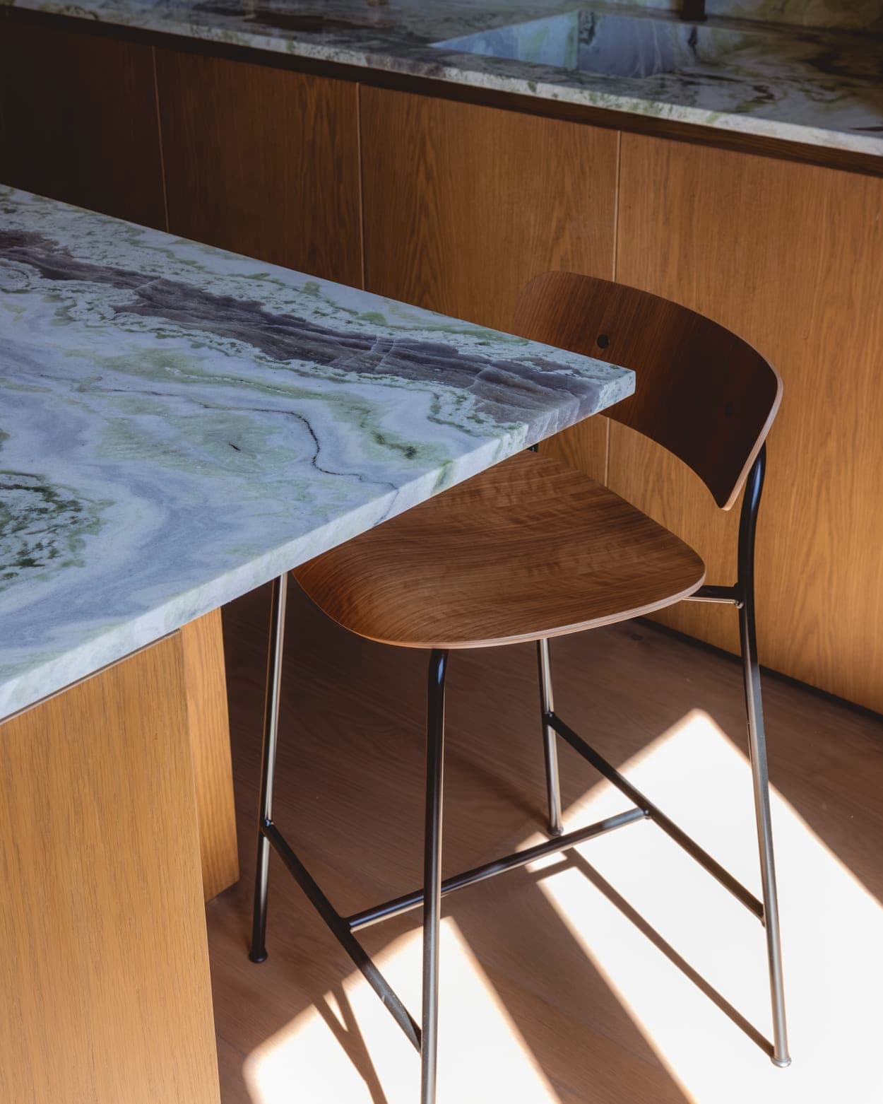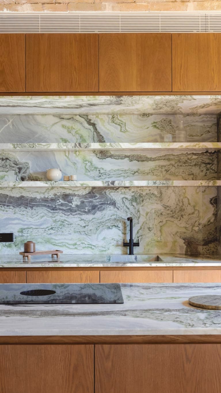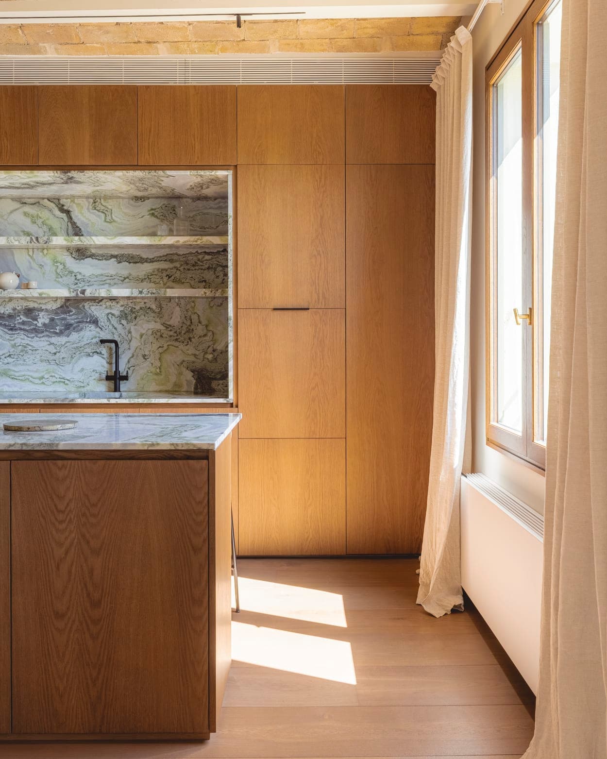 The layout centres around an open living and dining space with direct access to a balcony overlooking a notable landmark building. The adjoining kitchen is fitted with beautiful green marble worktops and integrated appliances, designed to blend into the main living area.