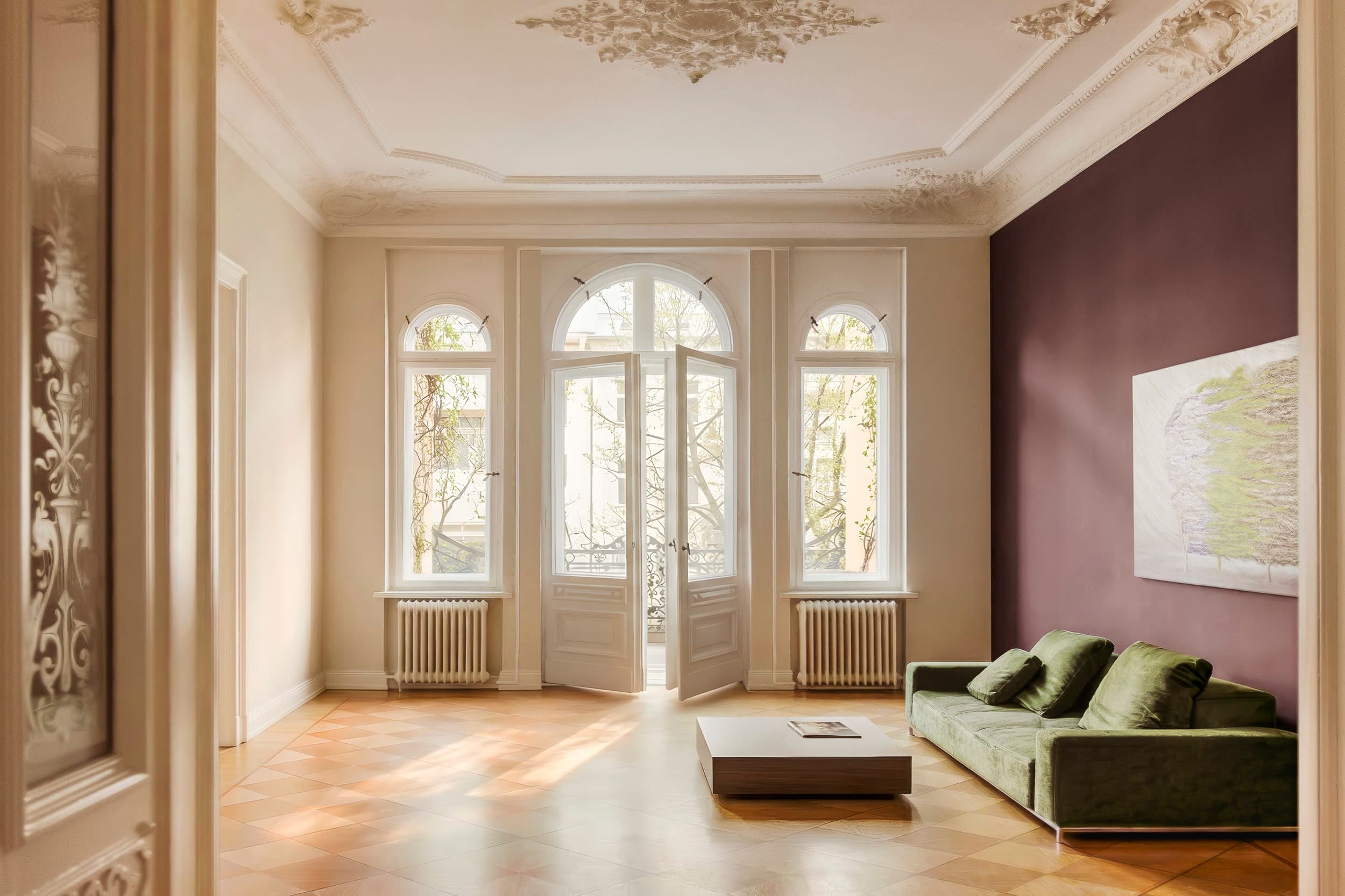 Located near Savignyplatz on a quiet, tree-lined street, this spacious period apartment is set on the third floor of a distinguished turn-of-the-century building with lift. Generous proportions, ceiling heights of around 3.40 metres and intricately preserved stucco details create an elegant sense of space, while original herringbone parquet flooring and panelled doors reflect the apartment’s historic character.