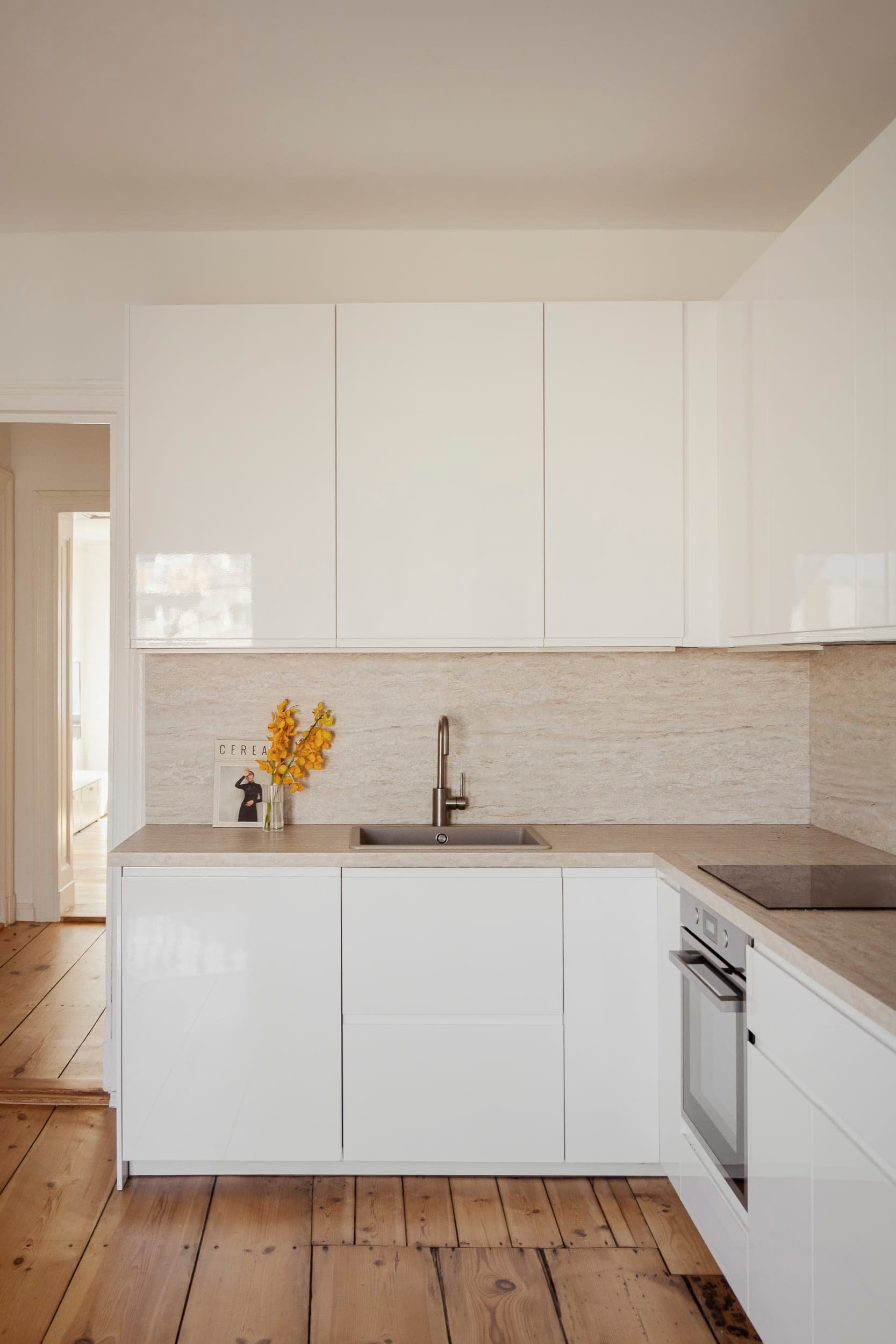 To the right, the open kitchen with dining area forms the social centre of the apartment. Clean white cabinetry and coordinated work surfaces create a cohesive and contemporary finish. From here, a door opens onto the sunny balcony of just over seven square metres. Elevated above the inner courtyard, it offers open views across the treetops towards the Siegessäule, providing a distinctive Berlin backdrop and a private outdoor retreat.