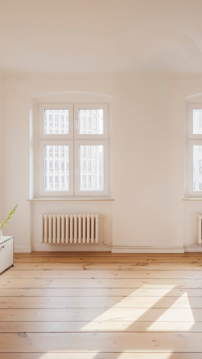 Inside, a compact hallway provides access to all rooms, creating a layout that feels intuitive and well balanced. To the left, the generously proportioned living room unfolds. Two symmetrically placed windows structure the wall and frame the outlook, while wide original timber floorboards and restrained ceiling mouldings underline the classic character without becoming decorative. The bedroom is positioned separately and enjoys green views, with clear proportions that allow for flexible furnishing and a calm, understated atmosphere.