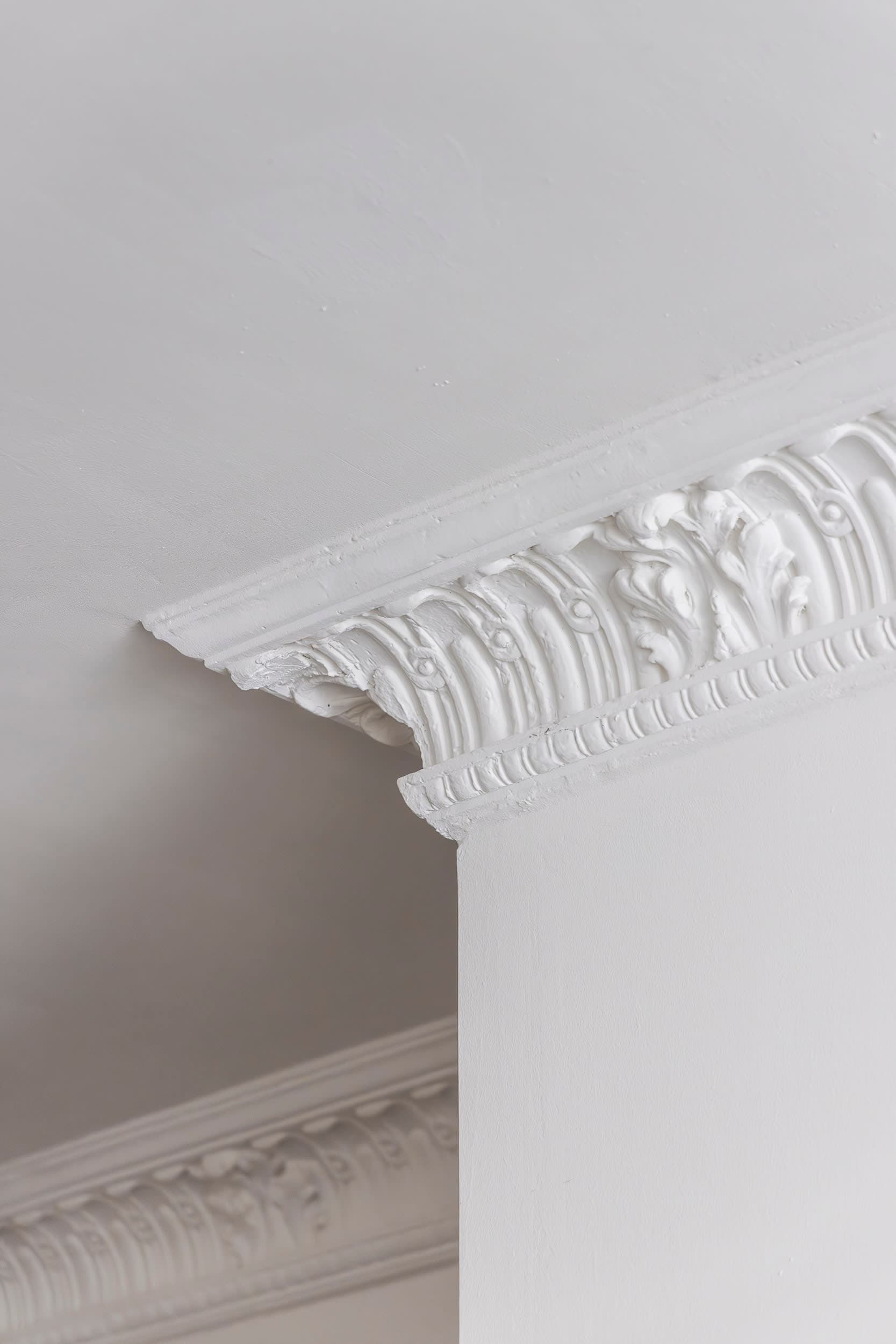 The rooms toward the yard are spacious (with 3 m high ceilings) and minimalist, with white walls and polished light concrete floors (with underfloor heating) that create an open, airy feel. Decorative molding lines the ceiling edges, adding a subtle, classic touch to the otherwise modern space. Large windows on the right fill the rooms with natural light.