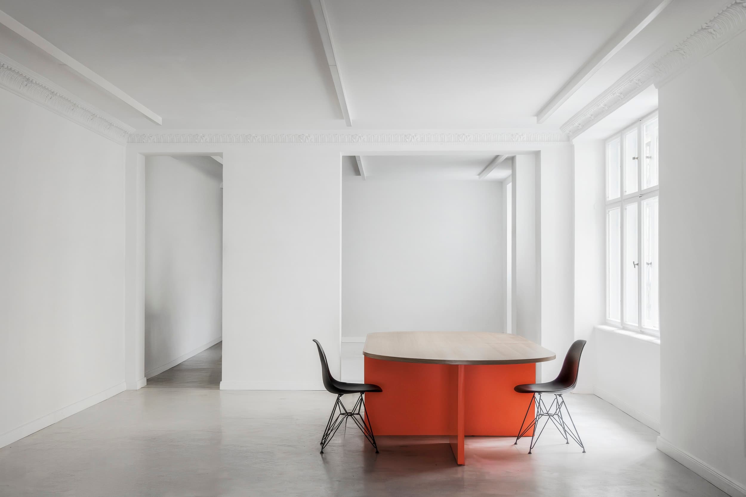 The space towards the street also embodies pure minimalist elegance, with soft natural light flooding through the large window. Every element here speaks to a refined simplicity, offering a blank slate brimming with possibilities.