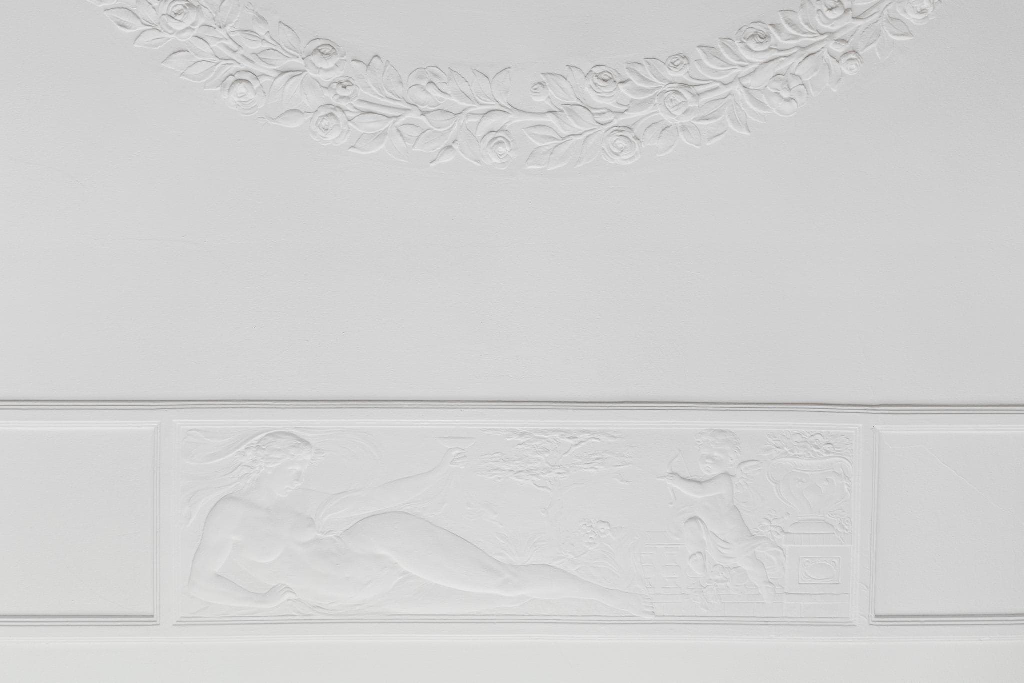 The restraint of the neoclassical facade from 1912 corresponds to the design features of this style. Order and structure should be recognizable and readable on the facade. This also included symmetry. The multi-storey bay window with attached balcony is typical and marks the center of the building. Rhythmically arranged windows continue the sequence on the right and left. Stucco was hardly used in Neoclassicism, here only as a relief structure on the bay window, which additionally emphasizes the vertical orientation of the building.