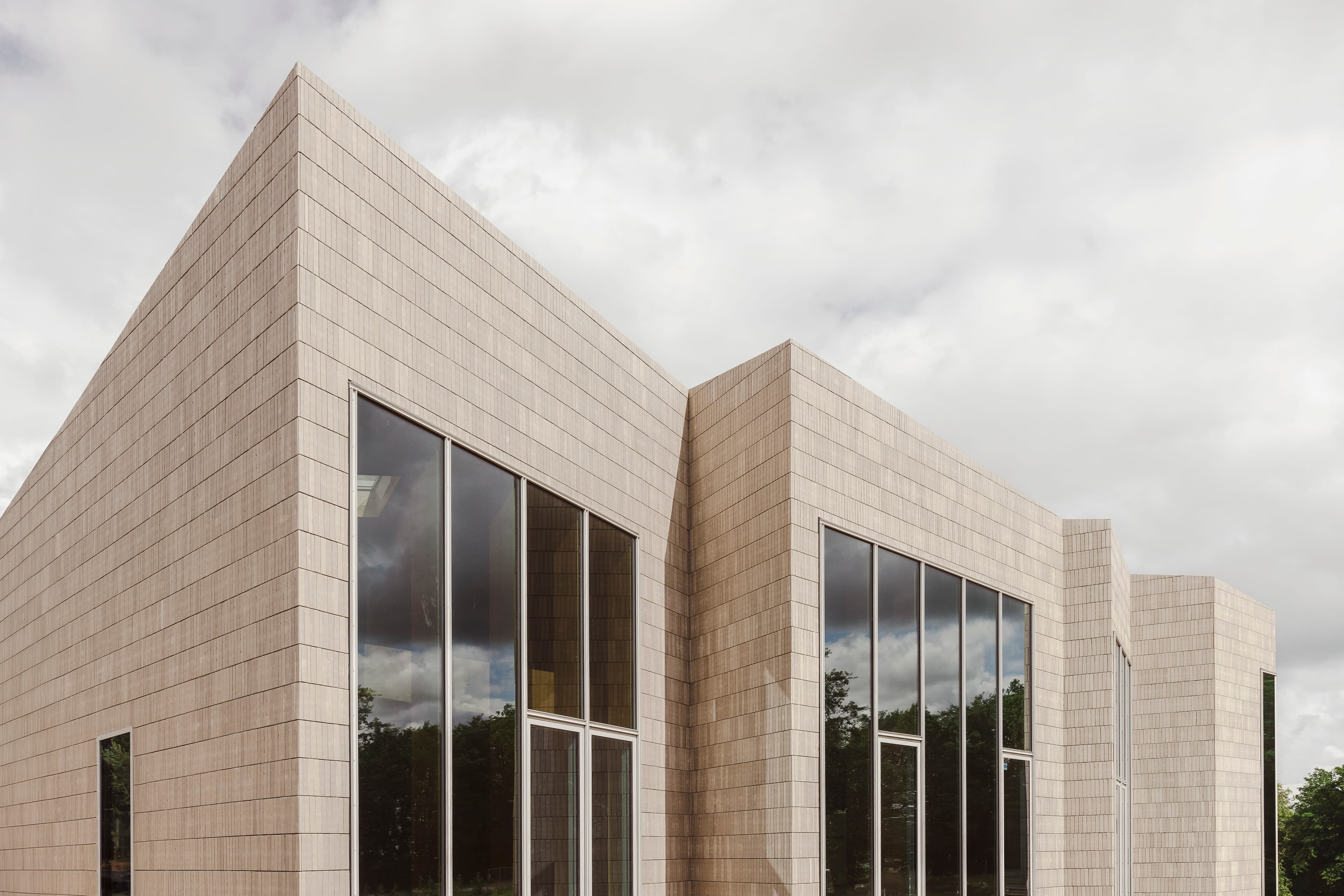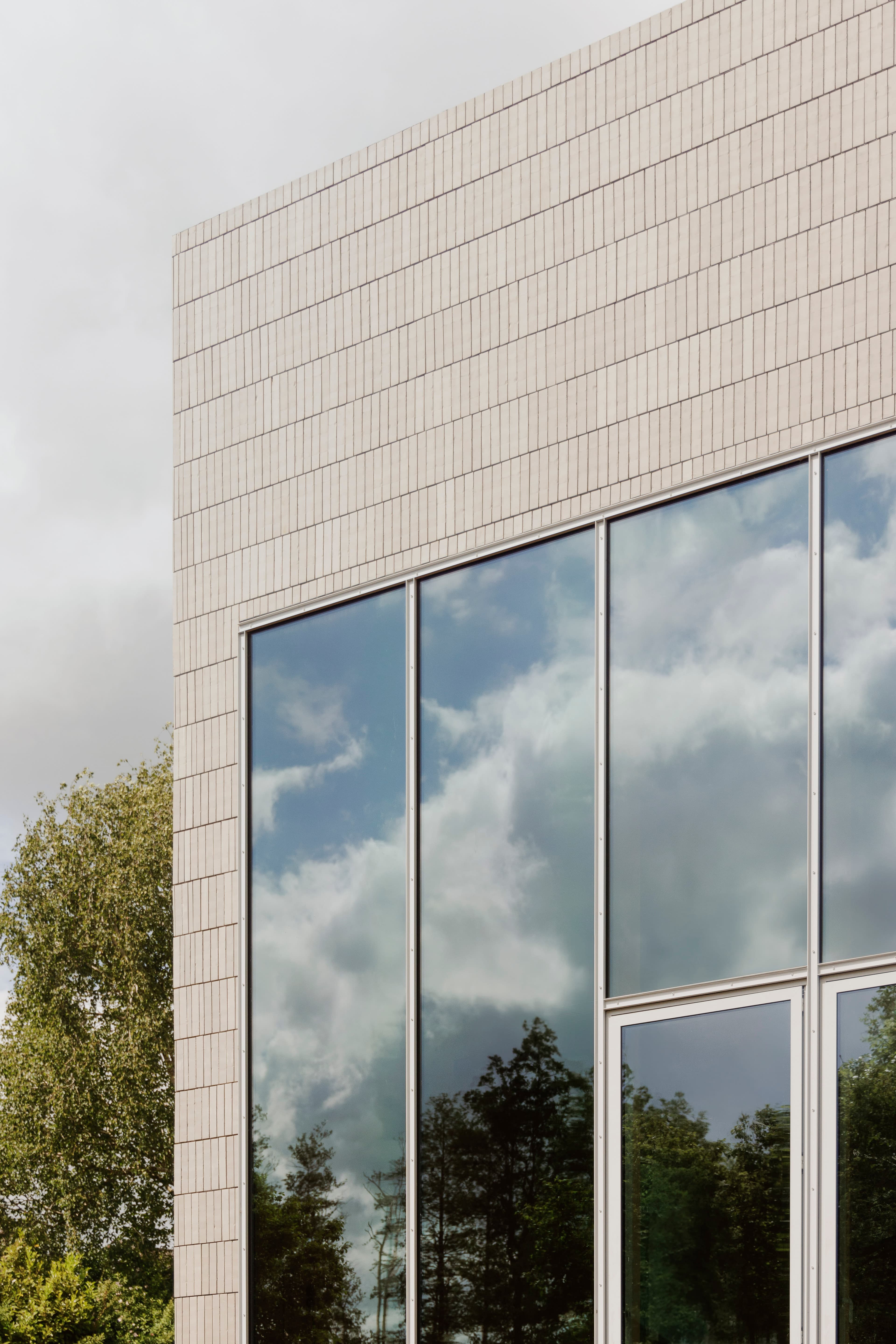 The façade structure is one of the key aspects from a design and technical point of view. It consists of a multi-part layered structure made of wood, insulation, foil and a rail system with clinker brick slips. The building can be dismantled as a single unit and the idea of the “building as a material store” is implemented very clearly and in a pragmatically simple form.