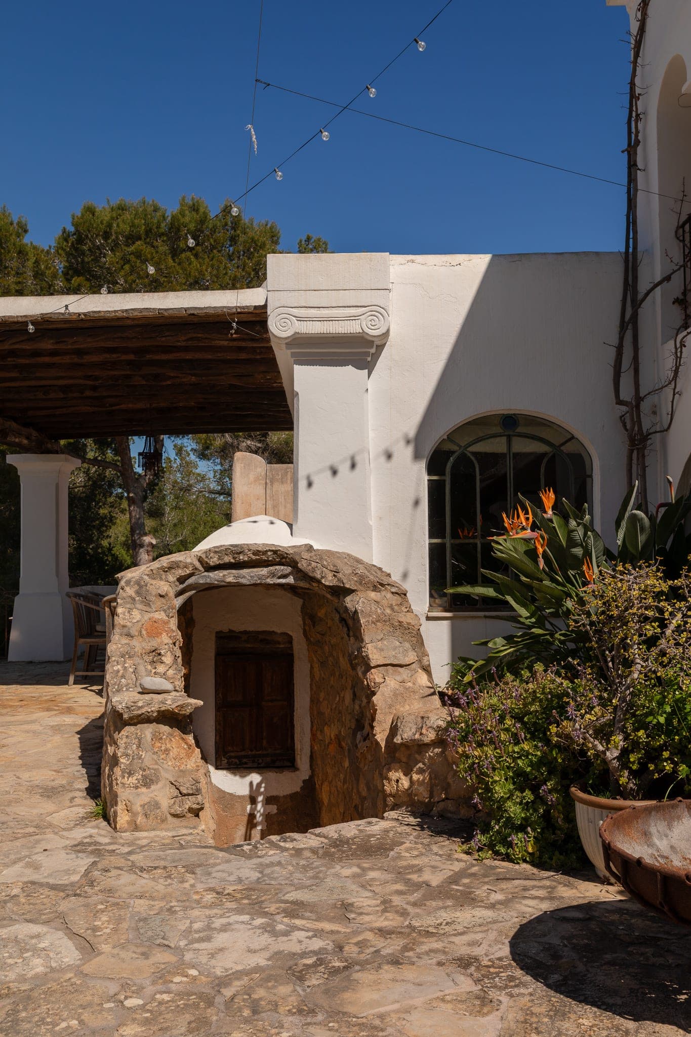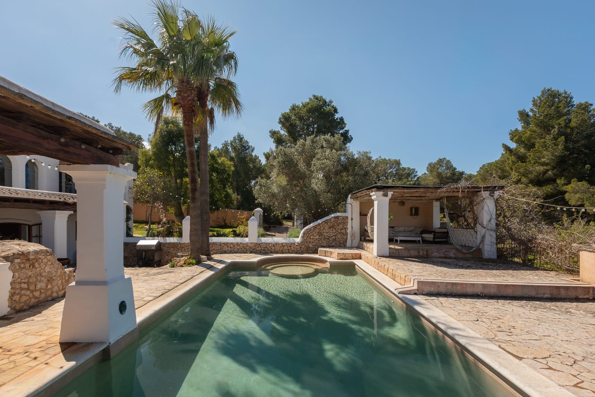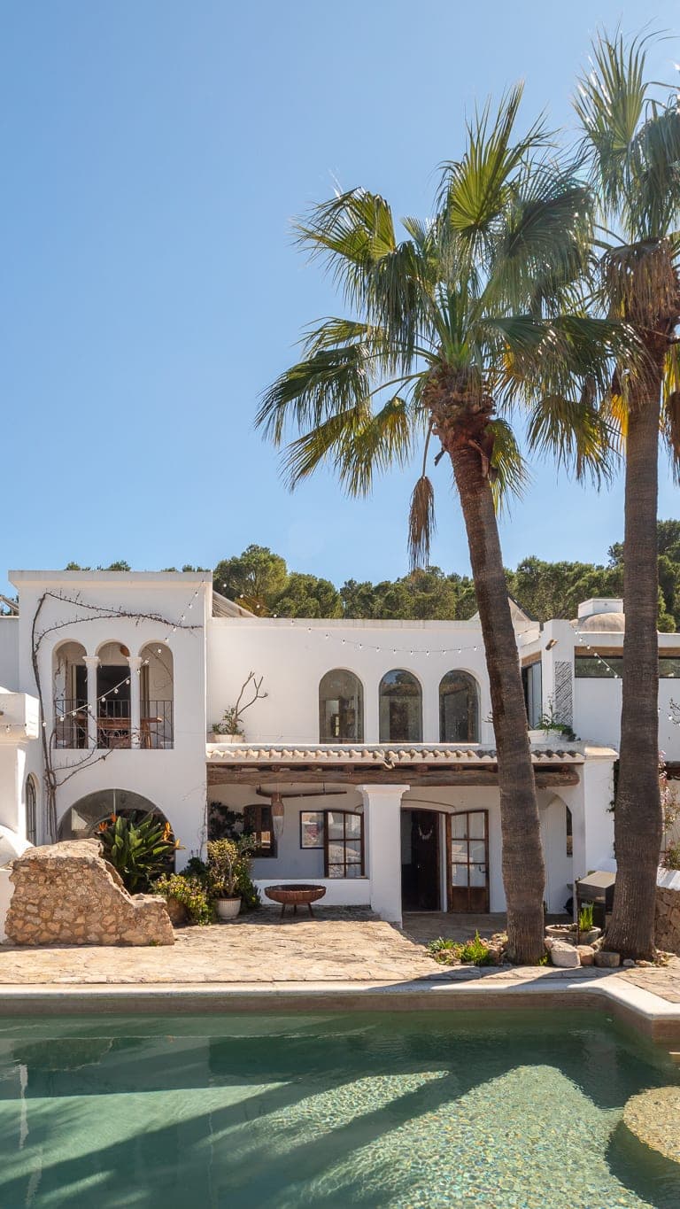 The architecture remains faithful to traditional Ibicenco lines — whitewashed volumes, deep-set windows, timber ceilings — yet the layout reflects its gradual evolution. Spaces connect naturally rather than symmetrically. Corners open unexpectedly. Terraces extend where views demand them.