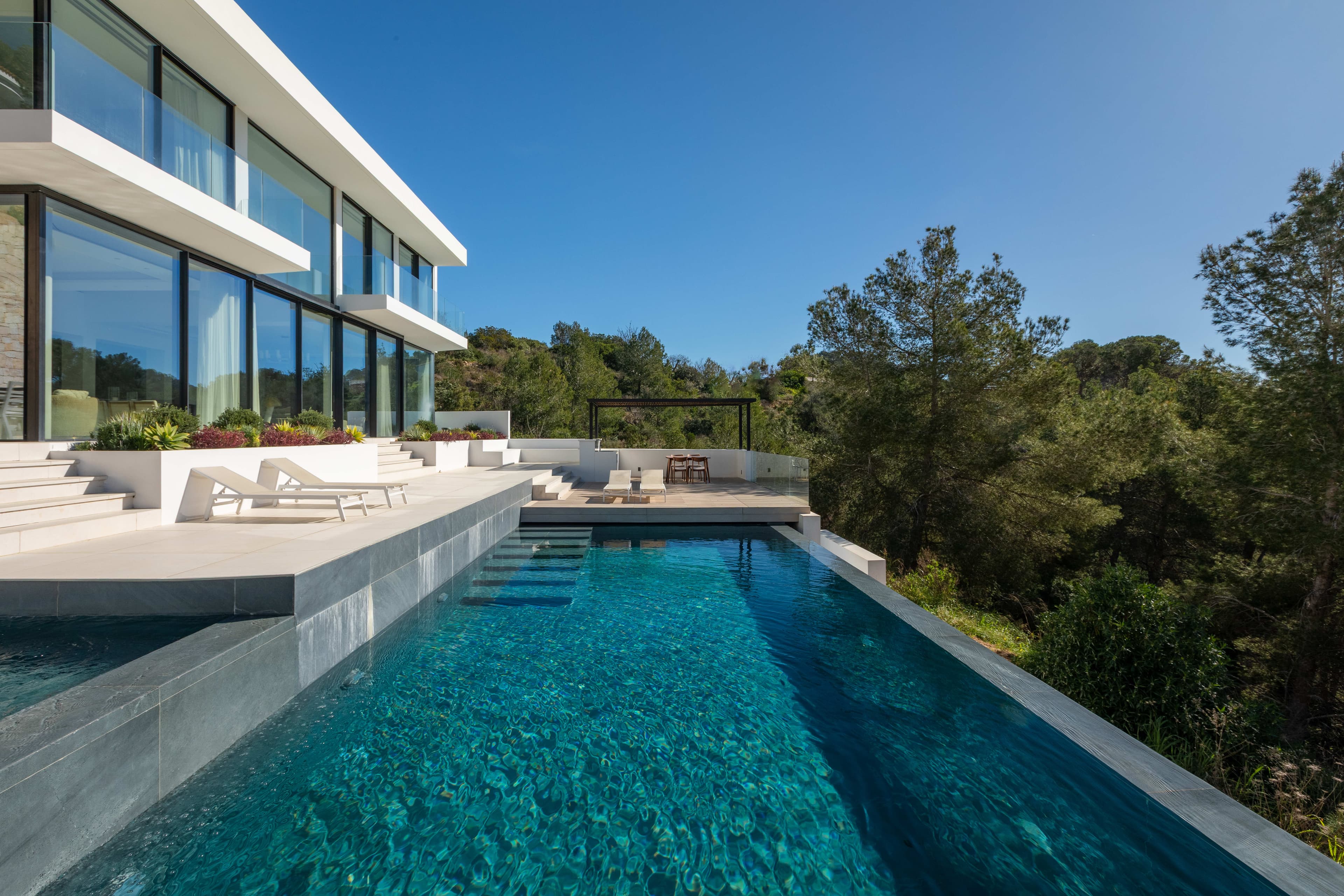 Set high within the gated community of Can Furnet, Villa Elia looks out across pine forest to the Mediterranean and the skyline of Dalt Vila. The position offers both elevation and discretion — five minutes from town, yet removed from it.