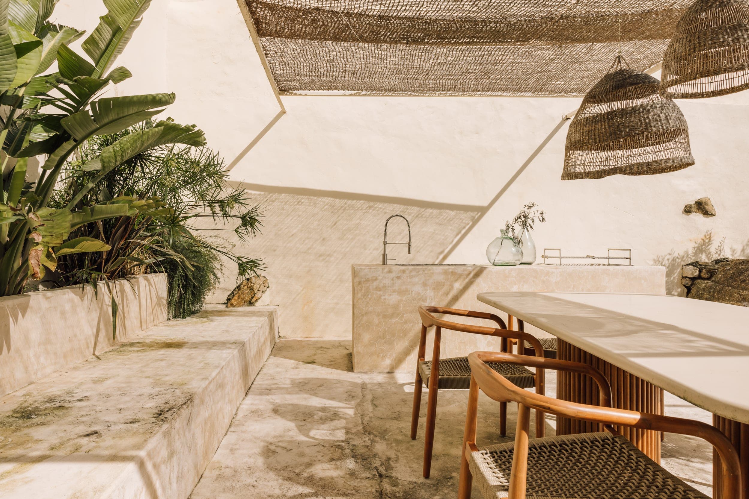 The outdoor space defines the experience of the property. A heated saltwater swimming pool sits within a landscaped garden designed for long days outside. The barbecue kitchen includes a natural stone sink and sits beneath tensioned shade nets that filter sunlight and create shifting patterns of shadow throughout the day. Three annex structures support the house with pool technical space, laundry, storage and an additional exterior bathroom. Private parking includes provision for an electric vehicle charging station.