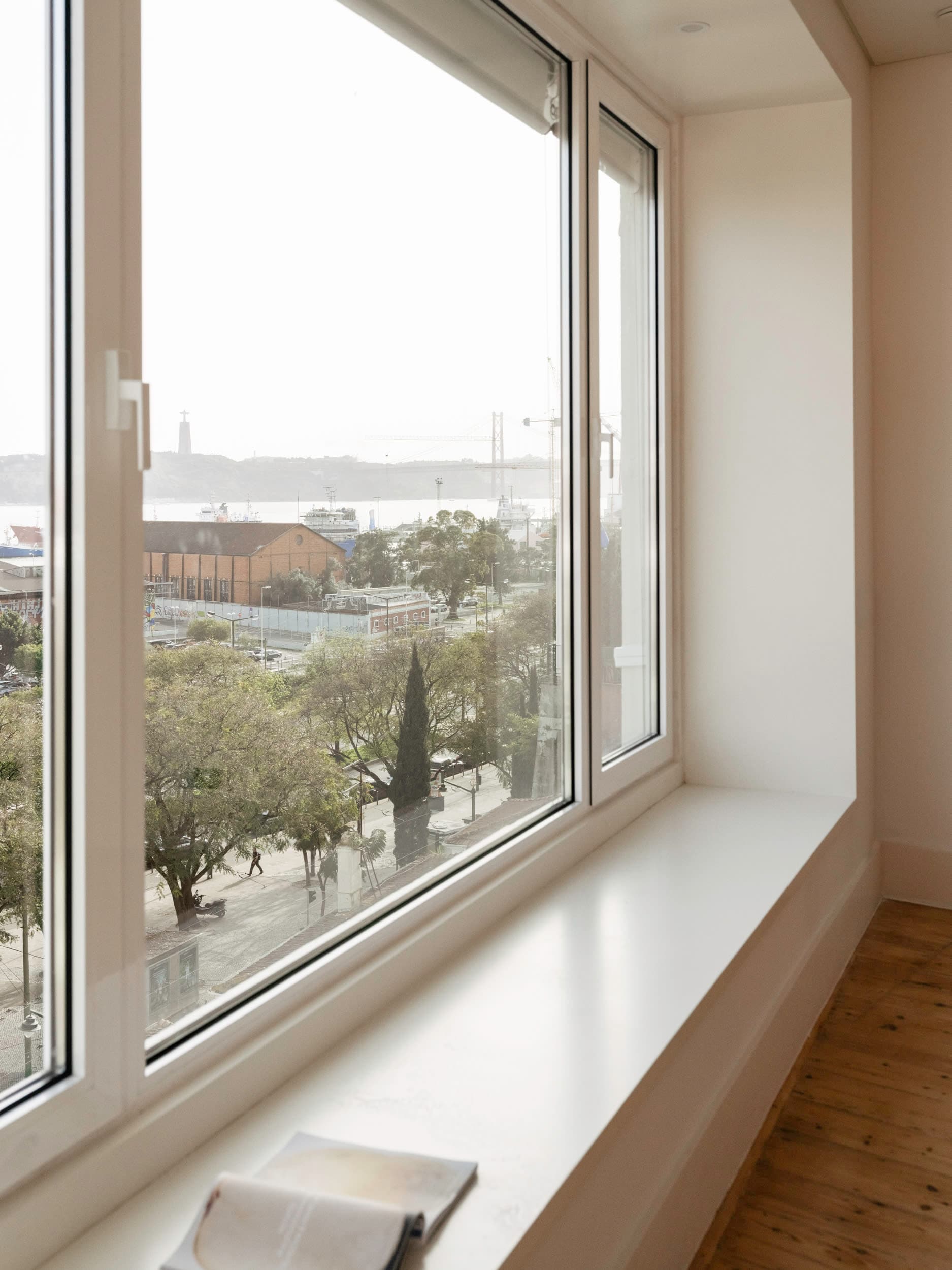 The living room occupies a central role in the layout, both in size and orientation. Its dimensions allow for multiple living areas, while the full-width opening toward the river defines the experience of the space throughout the day. The kitchen is positioned alongside, also facing the Tejo, combining everyday function with the same open outlook. A small terrace extends this relationship with the exterior.