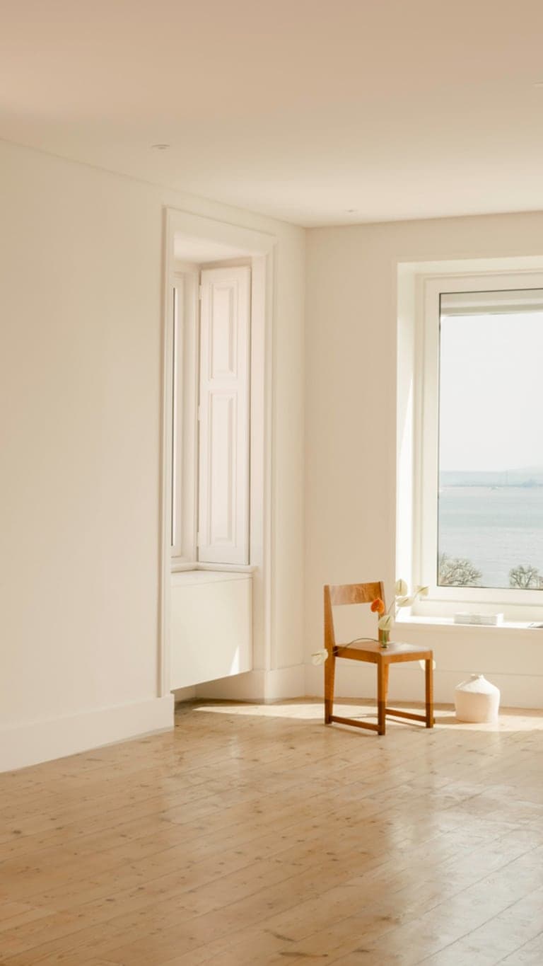 The plan follows the full depth of the building, a characteristic of this type of construction, extending from the street façade to the rear elevation. At the entrance, the rooms face a traditional Lisbon street, with open views across neighbouring façades and balconies. Moving through the apartment, the atmosphere gradually opens toward the river, where the scale of the spaces and the quality of light become more pronounced.