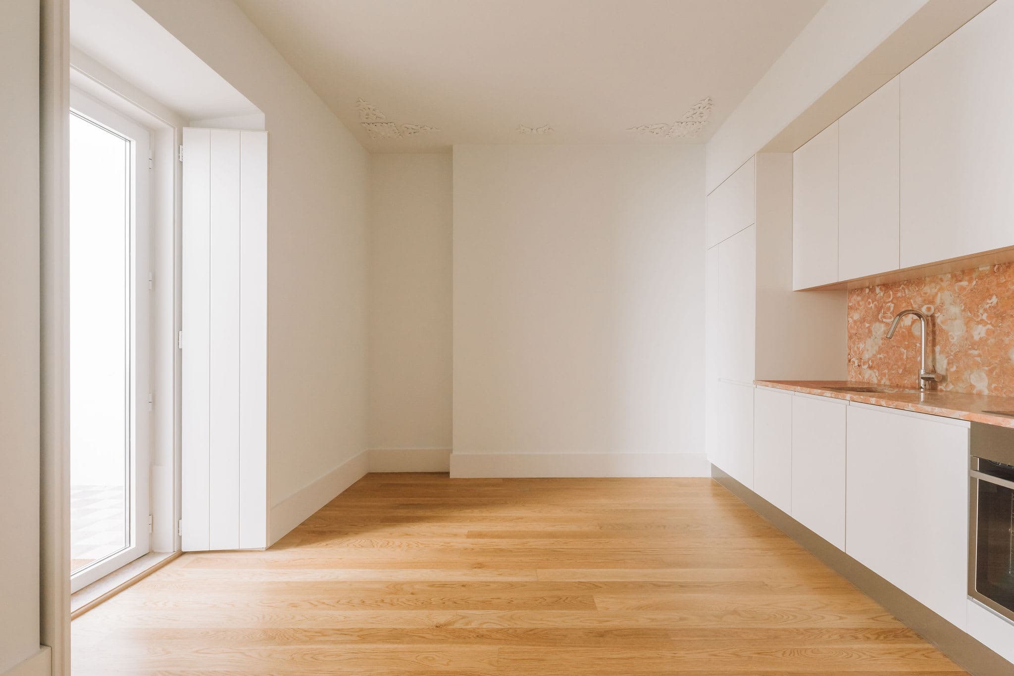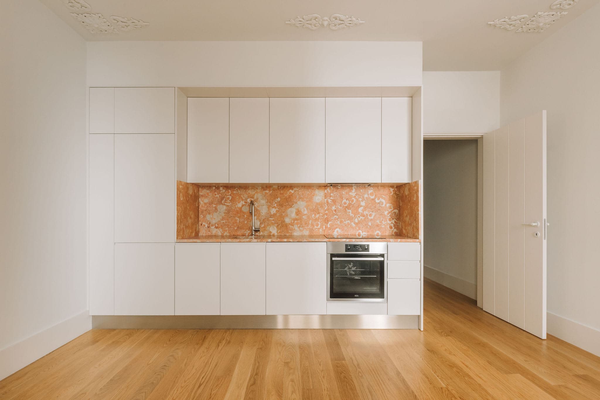 The kitchen is integrated and built with custom cabinetry and concealed appliances, including an induction hob, oven and extractor. A marble in ivory and soft orange tones is used for the countertop and backsplash, introducing texture and colour within an otherwise restrained palette. Decorative plaster ceiling details add a subtle layer of ornament, referencing traditional interiors while remaining measured.