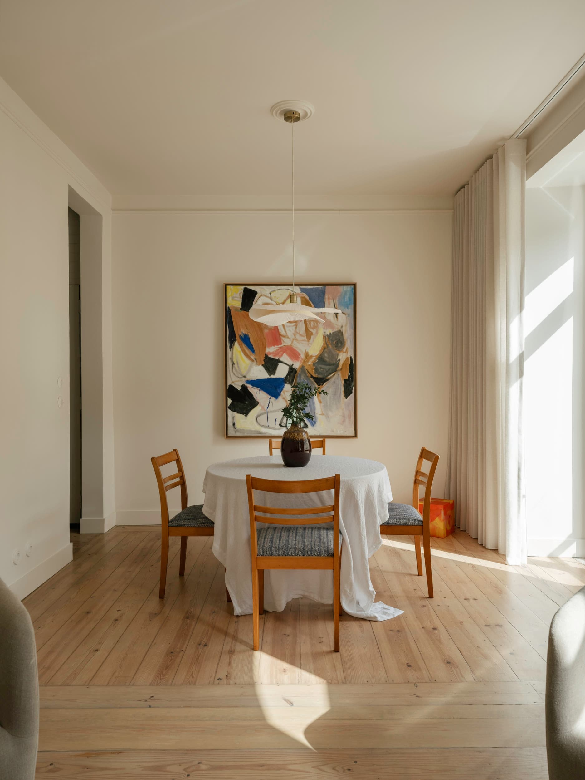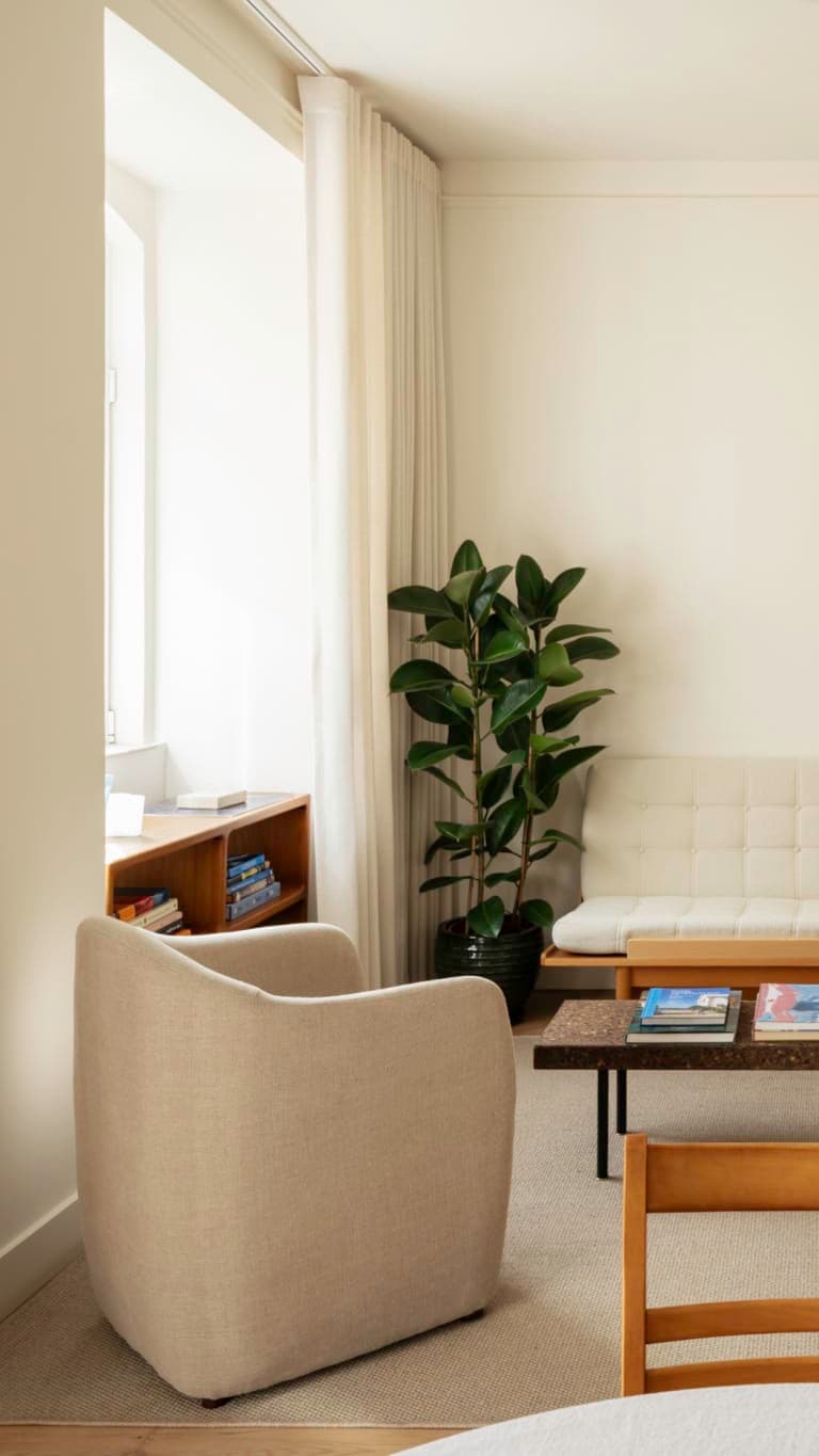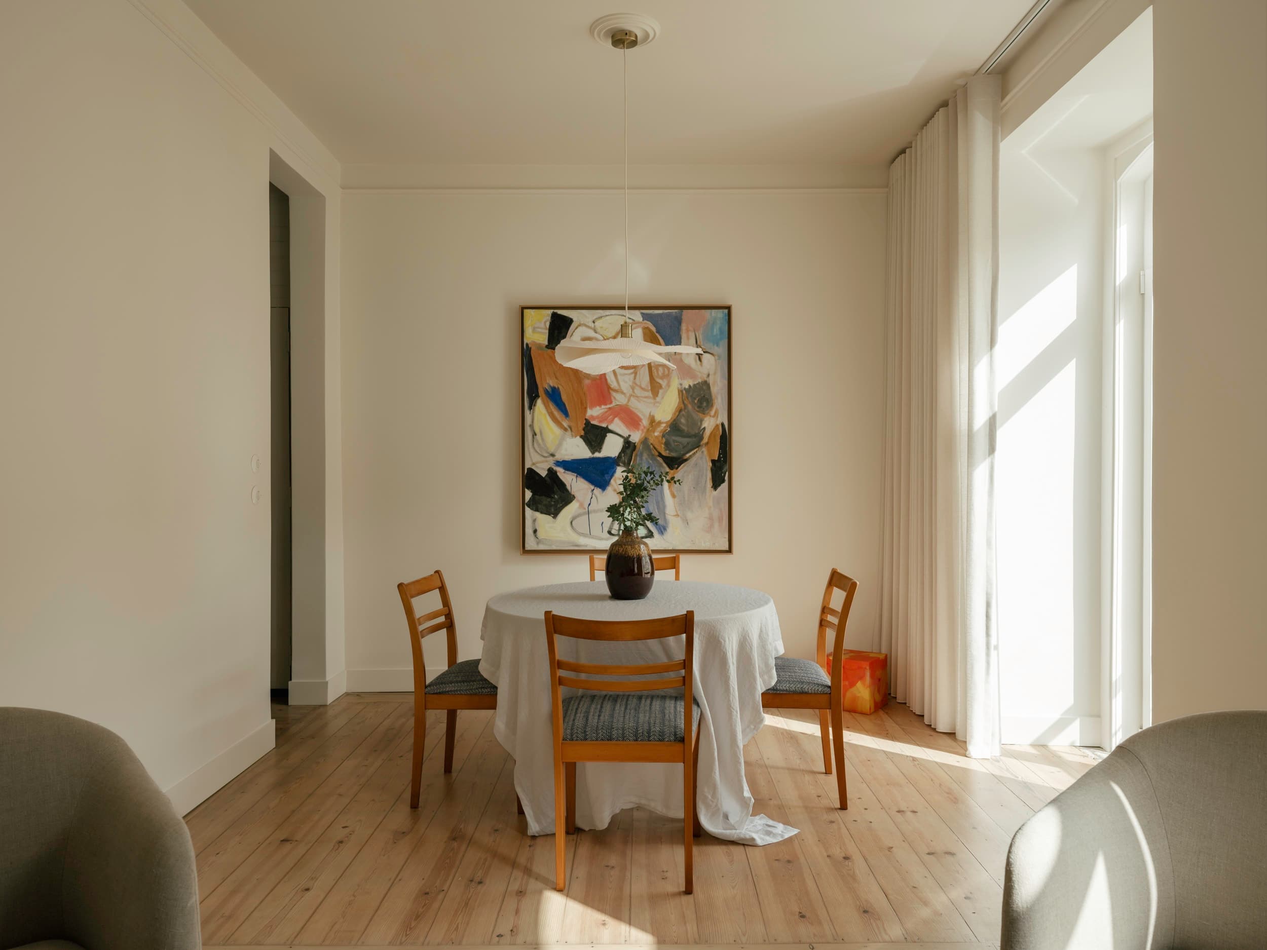 On a quiet residential street in Estrela, this three-bedroom apartment has been recently renovated by a Swedish architect with a clear Scandinavian design approach. The living room opens onto a small traditional Lisbon balcony overlooking the colourful façades of the street, with a glimpse of the river and the Cristo Rei statue in the distance. The project focuses on calm materials, careful craftsmanship and the preservation of original elements, combining Nordic design sensibility with the character of a traditional Lisbon building.