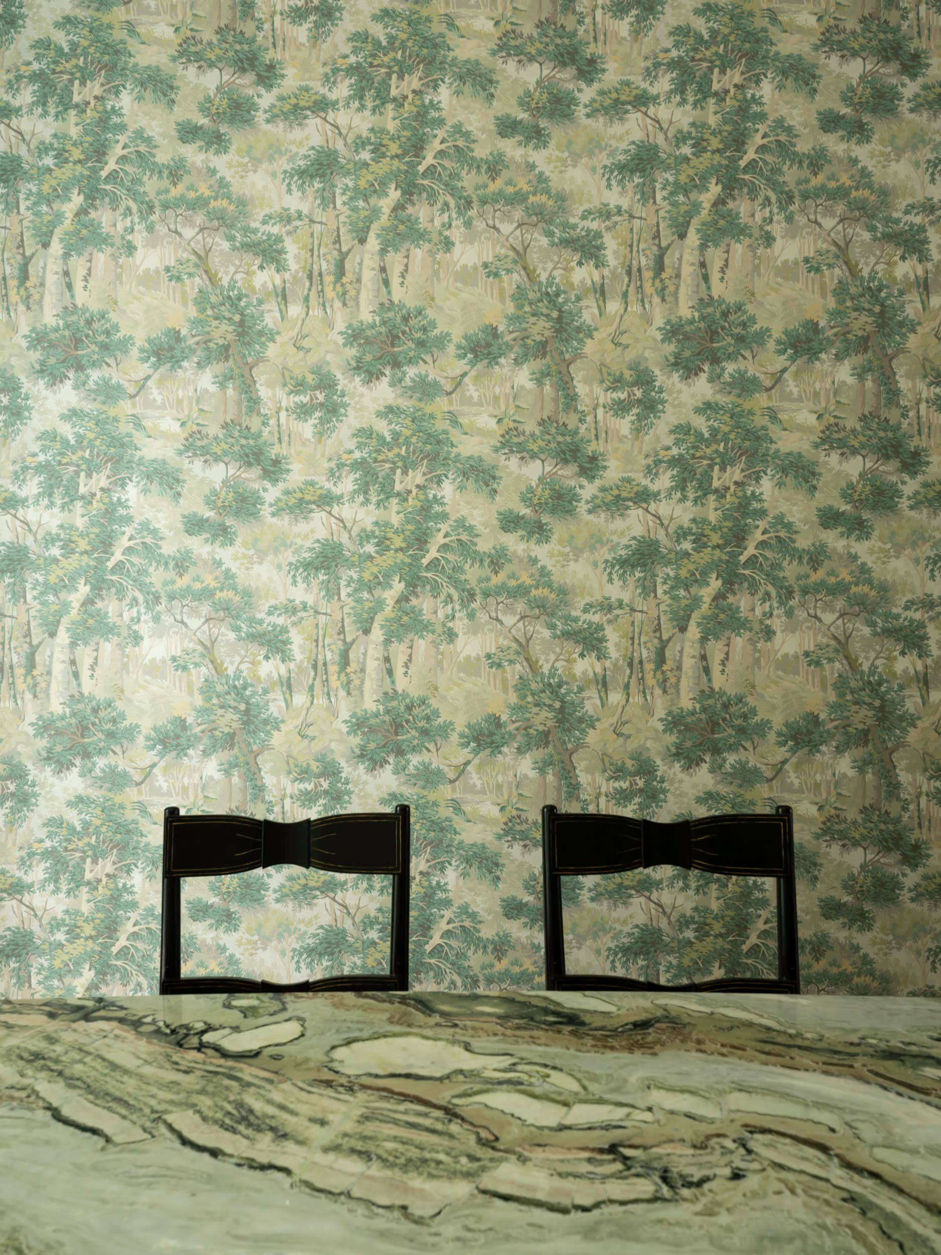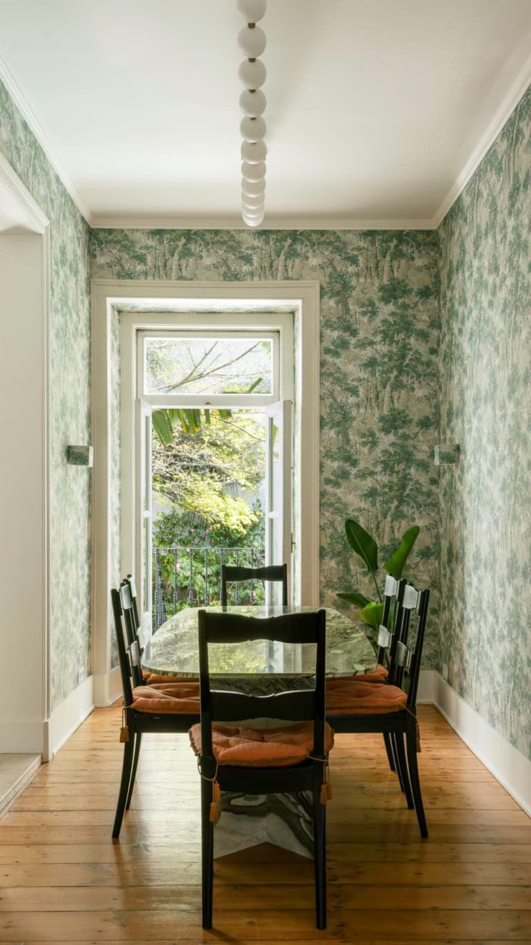 Inside, the renovation respects the proportions of the original building while introducing a more expressive interior language. Pattern, colour and material appear throughout in a layered way, balanced by original elements such as timber flooring and preserved ceilings. The main living room and principal bedroom retain their ornate ceilings, anchoring the apartment within its period context.