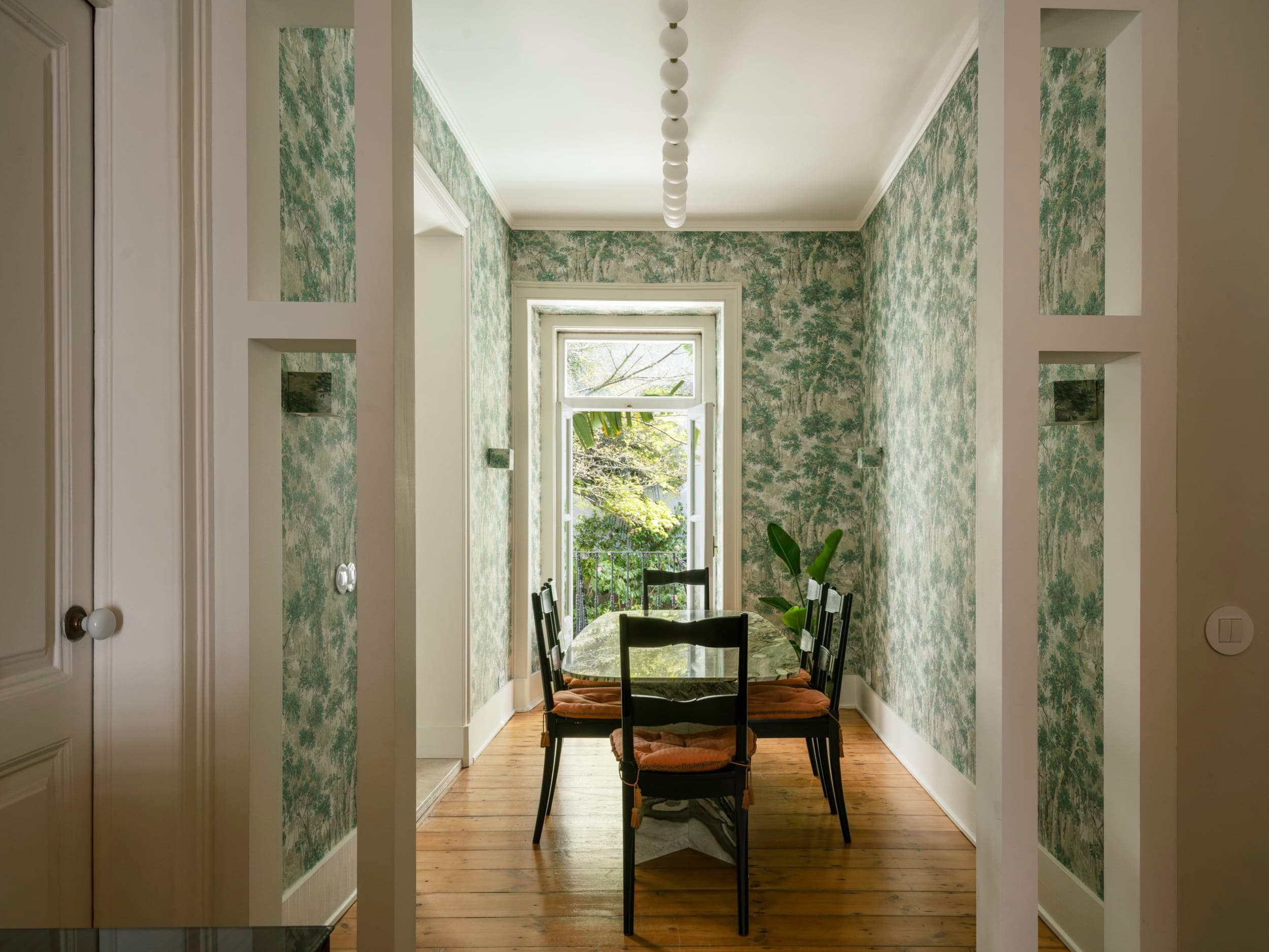 The kitchen combines original Portuguese tiles with new cabinetry and Portuguese marble surfaces. It is fully equipped with new integrated appliances. Adjacent to it, the dining area reflects a more expressive material approach, contributing to the overall character of the home. A separate laundry room supports daily use.