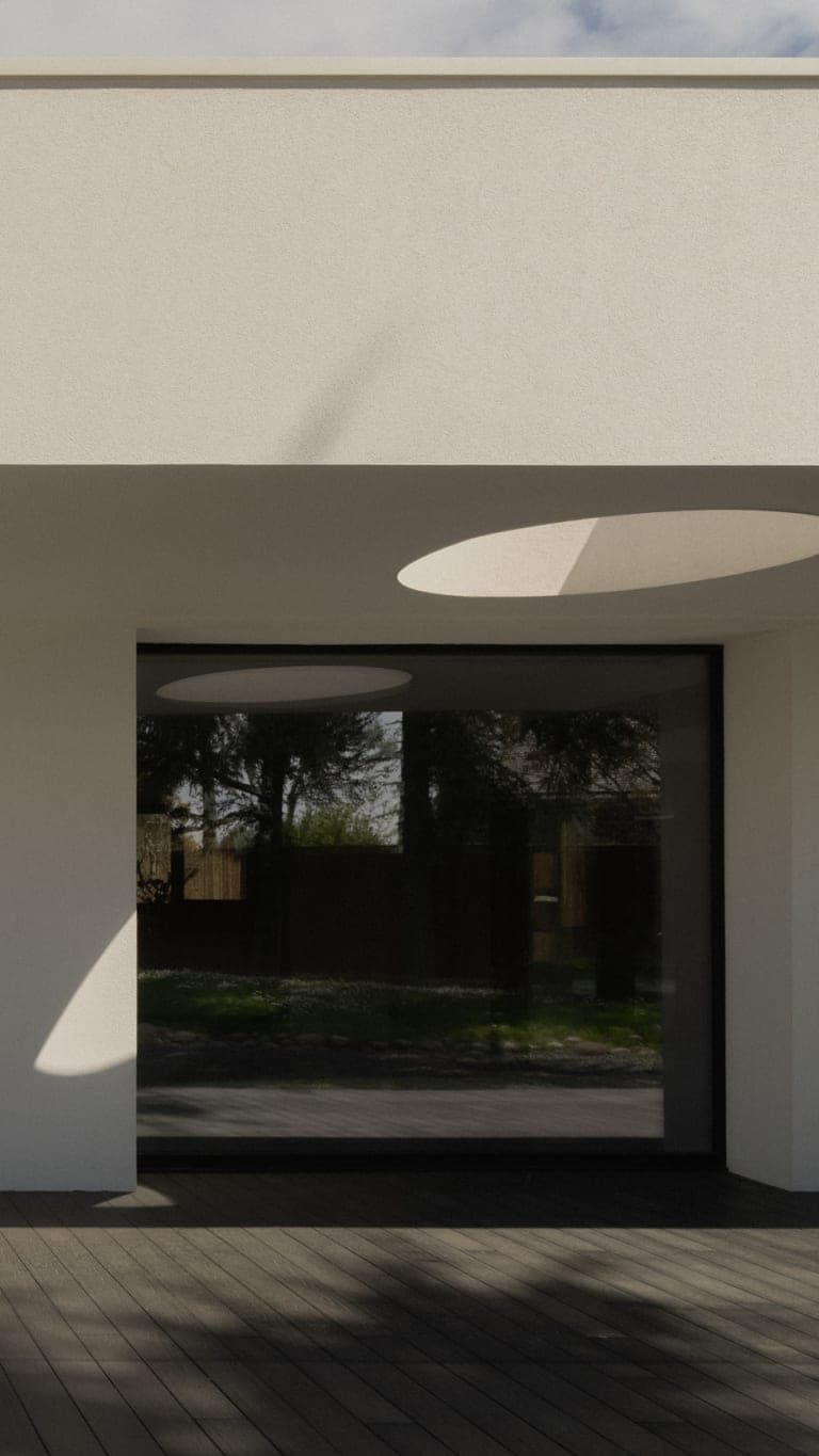 With a south-west orientation and large windows, the house engages naturally with light throughout the year. Winter sun enters deeply. In summer, it is filtered and controlled. The architecture responds to the environment rather than resisting it.
