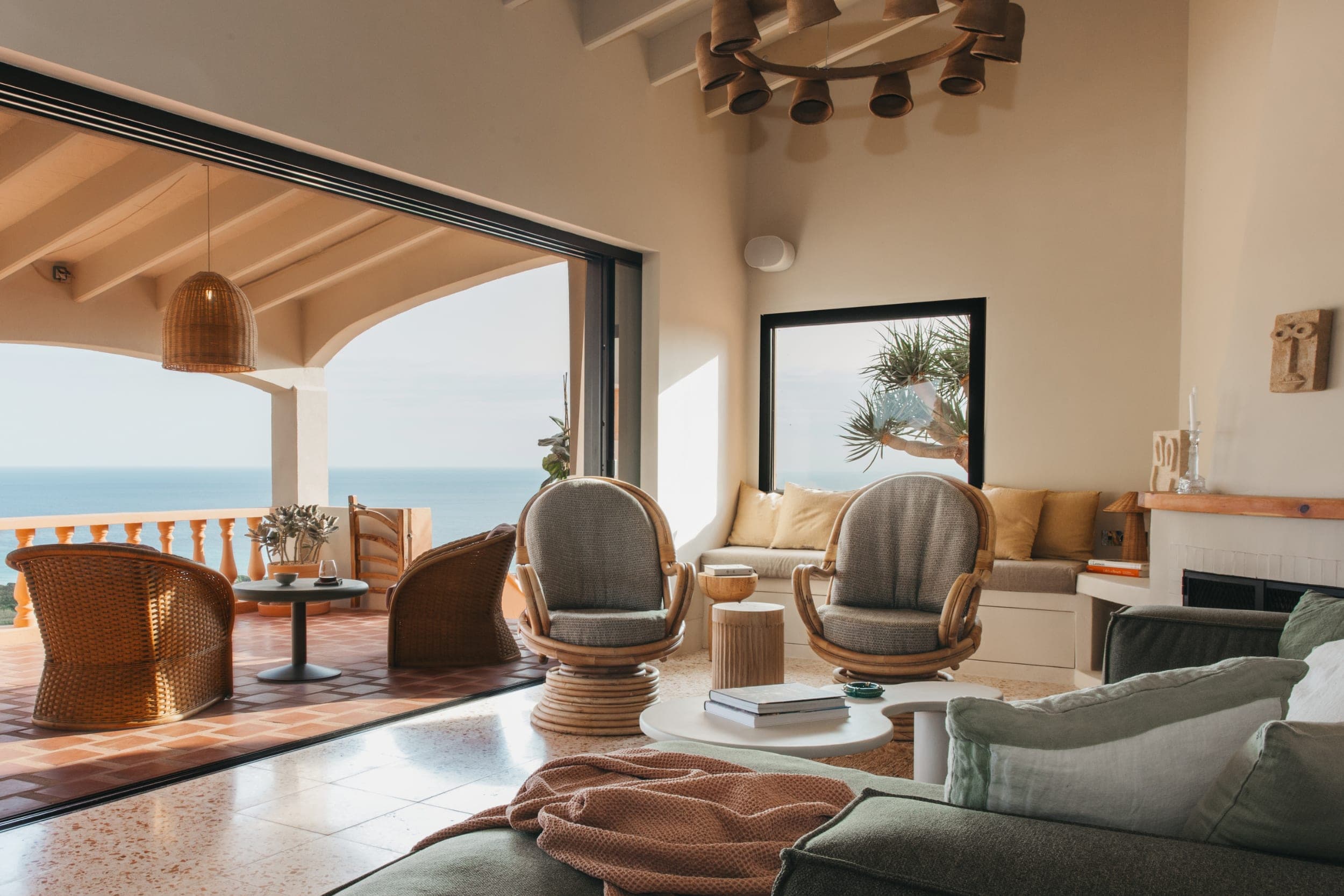 Inside, the house opens to generous living and dining areas oriented toward the sea. Large openings allow light to move freely through the space, while natural materials and a restrained palette create a calm and continuous atmosphere. A fireplace introduces a more intimate setting during the cooler months.