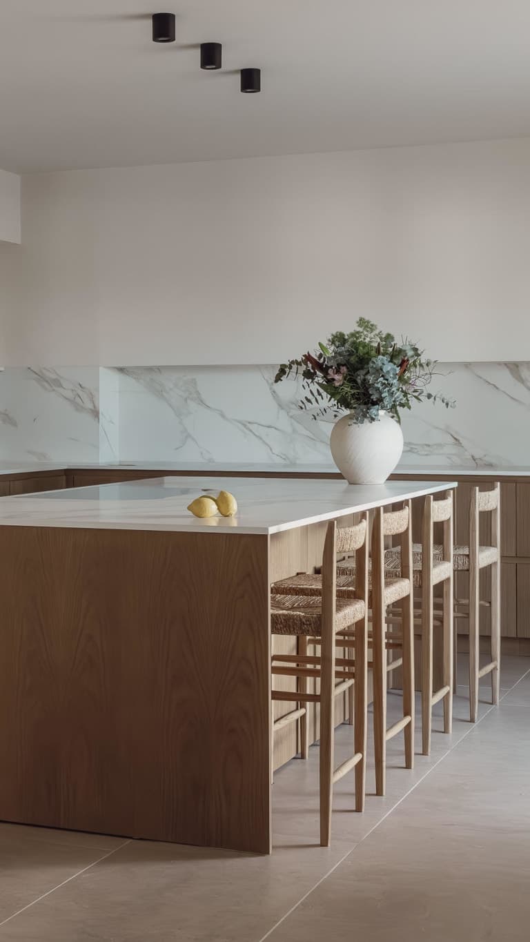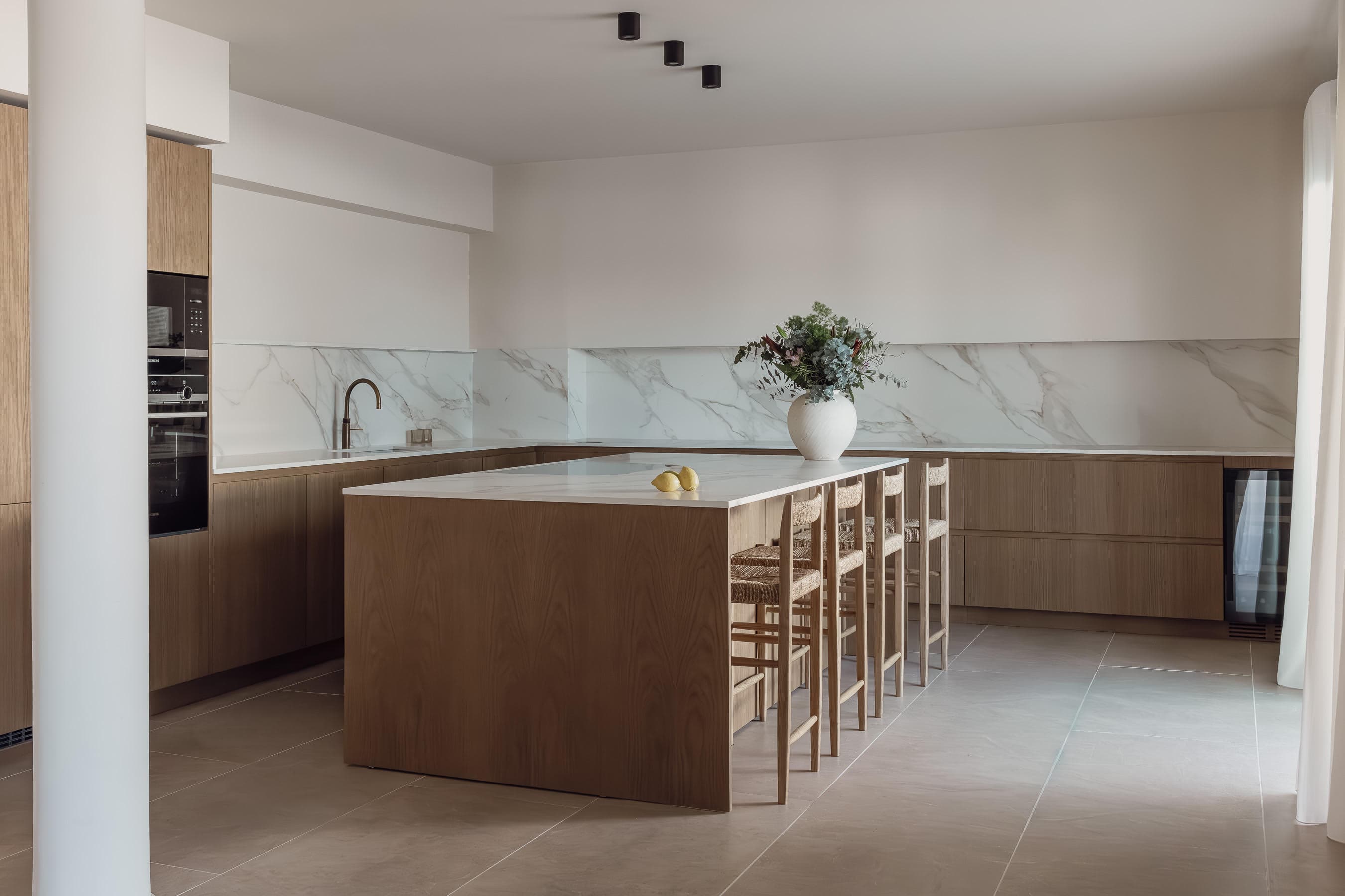 The interiors are defined by clarity and craftsmanship. A generous oak kitchen by Cocinart with island anchors the living space, complemented by porcelain tiles in a continuous 60 × 120 format that extend seamlessly indoors and out. Fixtures by Hansgrohe, Duravit and Duran, alongside appliances from Bora, Siemens and Miele, reflect a consistent focus on quality. Central heating, air conditioning, integrated shading and a private parking space complete the picture