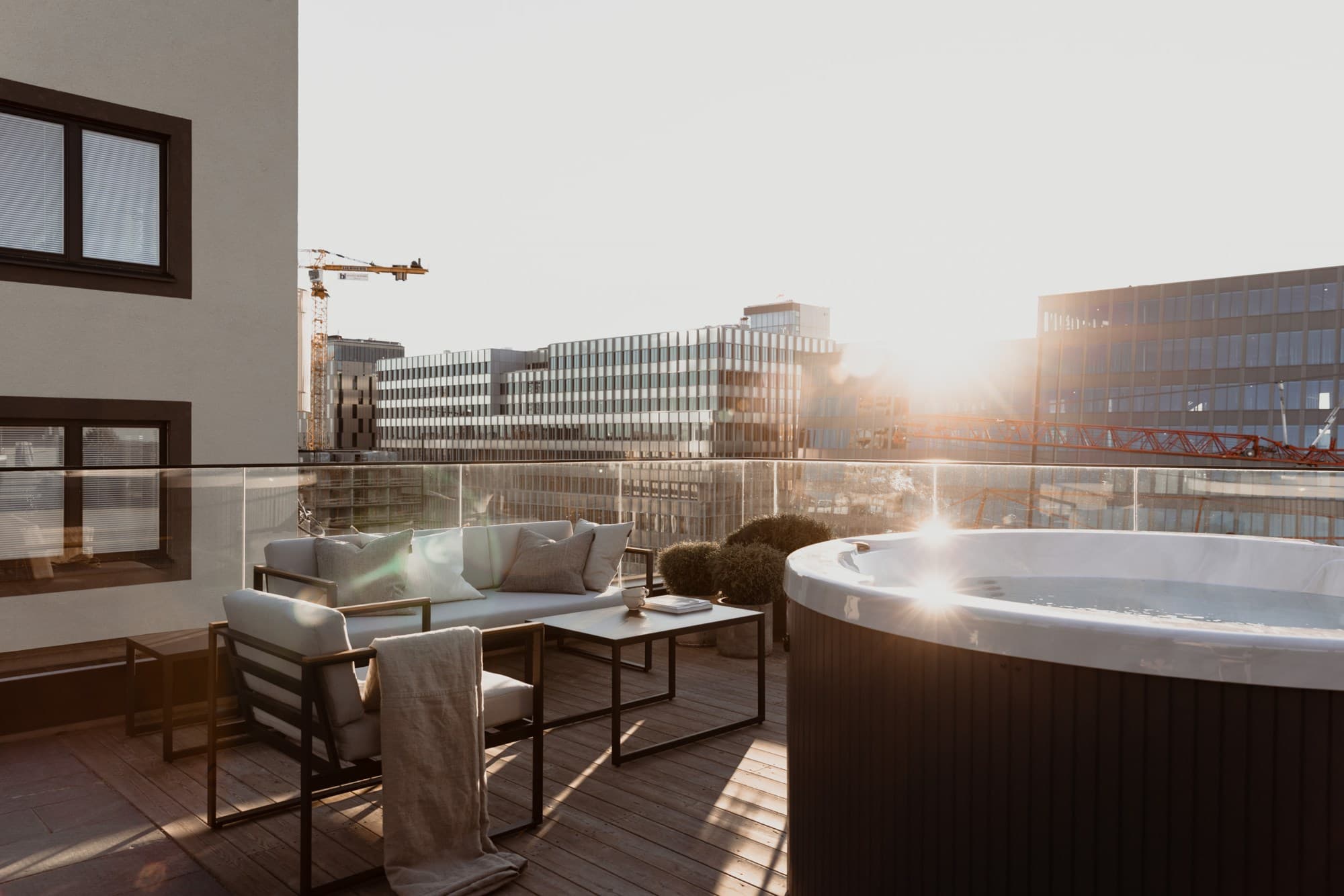 Den exklusiva takterrassen med utekök, bubbelpool och dusch har en fantastisk utsikt över Hagastaden och Stockholms takåsar. Här kan man njuta hela dagen från det att solen går upp tills den går ner.