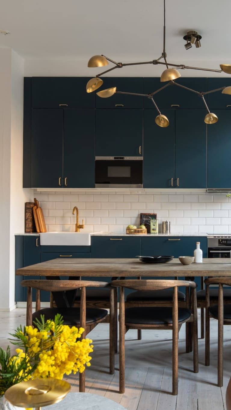 Köket i blå kulörer med marmorbänk ger en modern kontrast till den klassiska stilen och blir en självklar samlingspunkt. Diskmaskin finns, arbetsytorna är generösa och helheten känns genomtänkt.