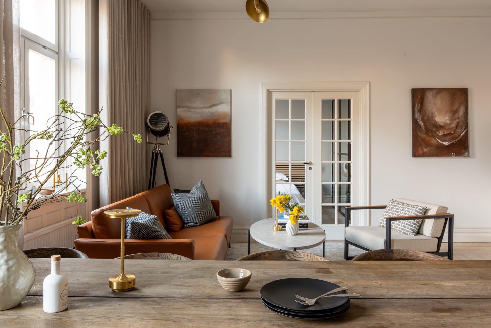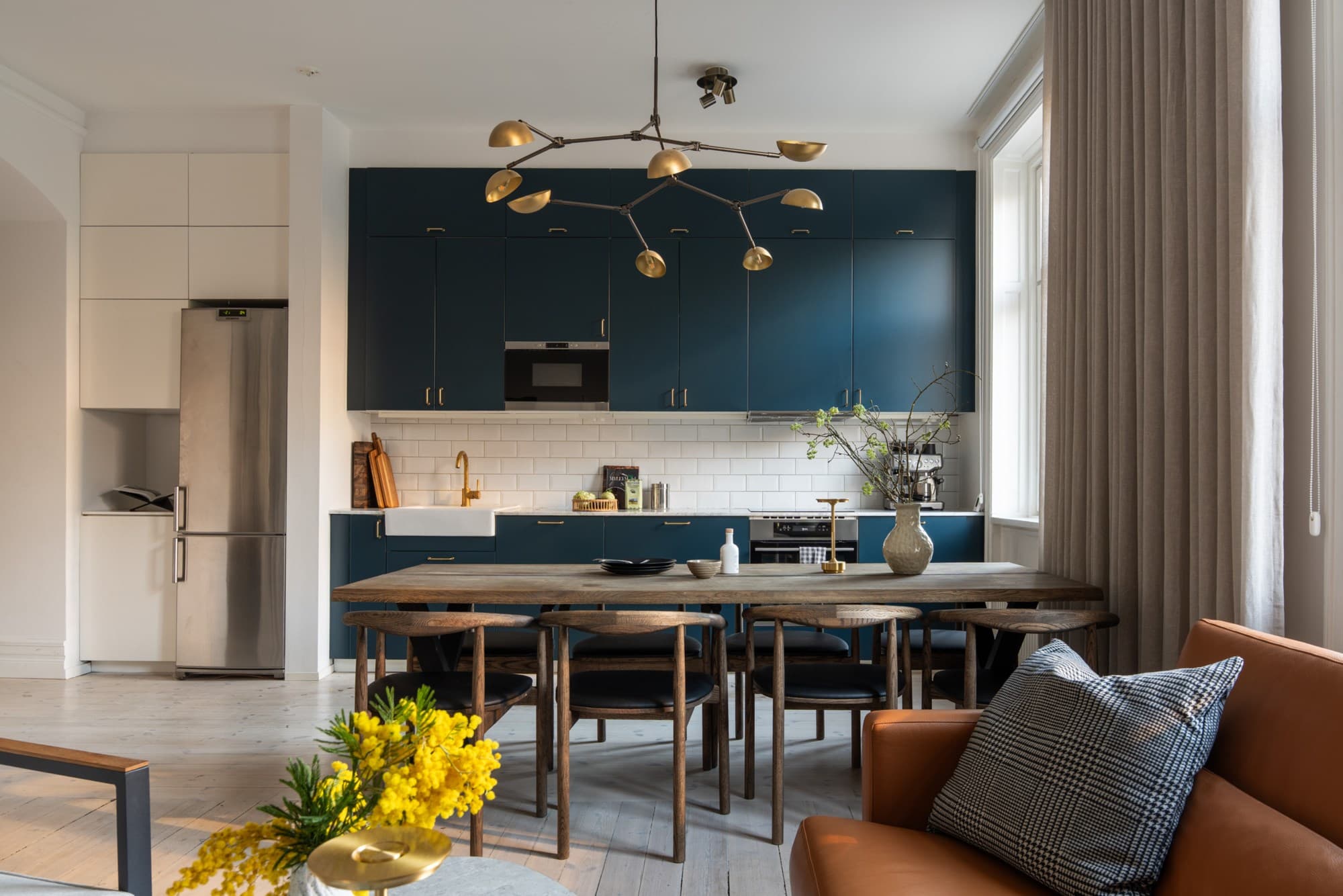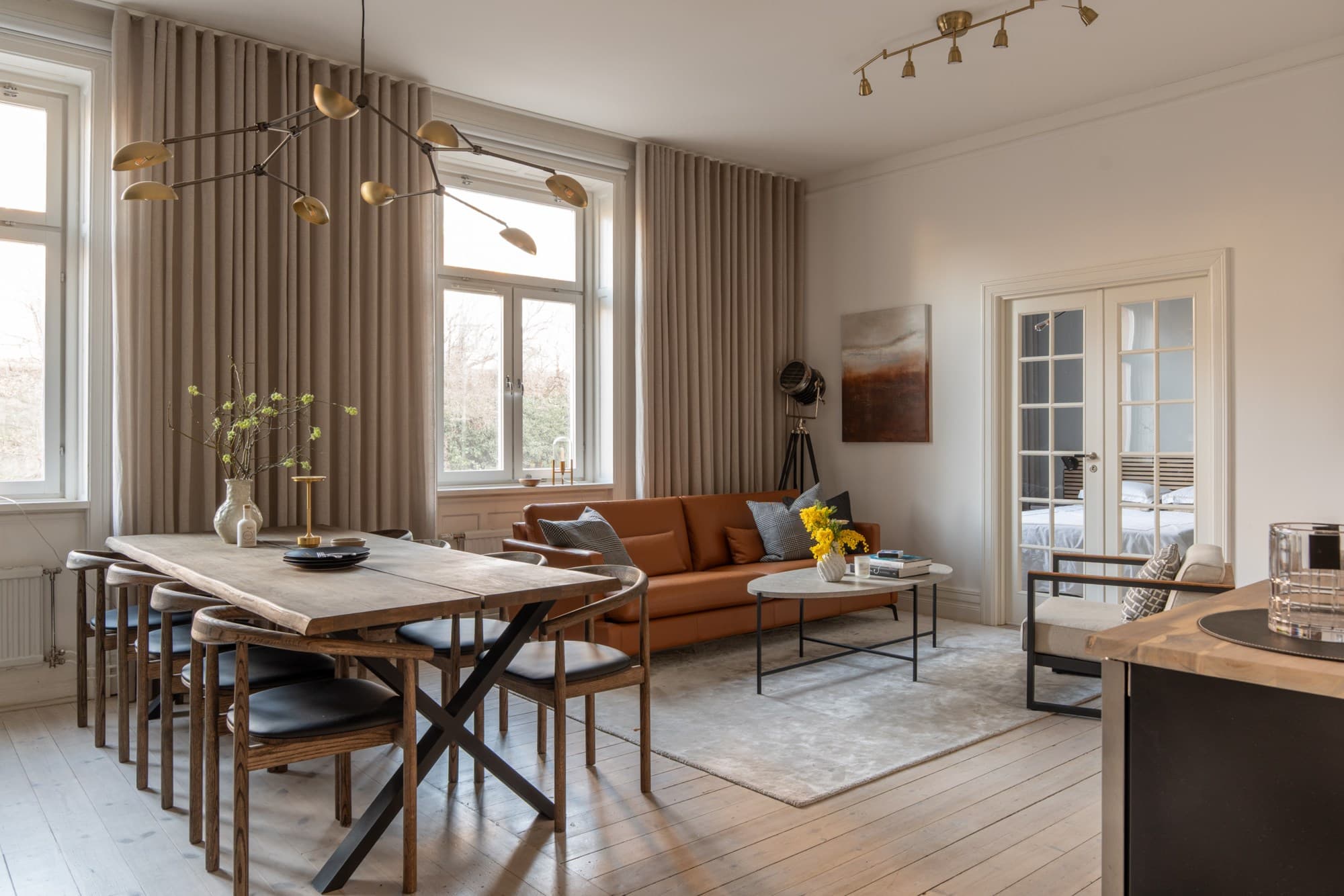 Planlösningen är öppen och social. Här finns gott om plats för ett stort matbord där vänner kan samlas för långa middagar, och samtidigt ryms en generös soffgrupp. Det är ett hem som bjuder in – till vardagsliv, middagar, födelsedagar och spontana kvällar med vänner. Rummen hänger ihop på ett naturligt sätt och skapar en luftig, välkomnande atmosfär.