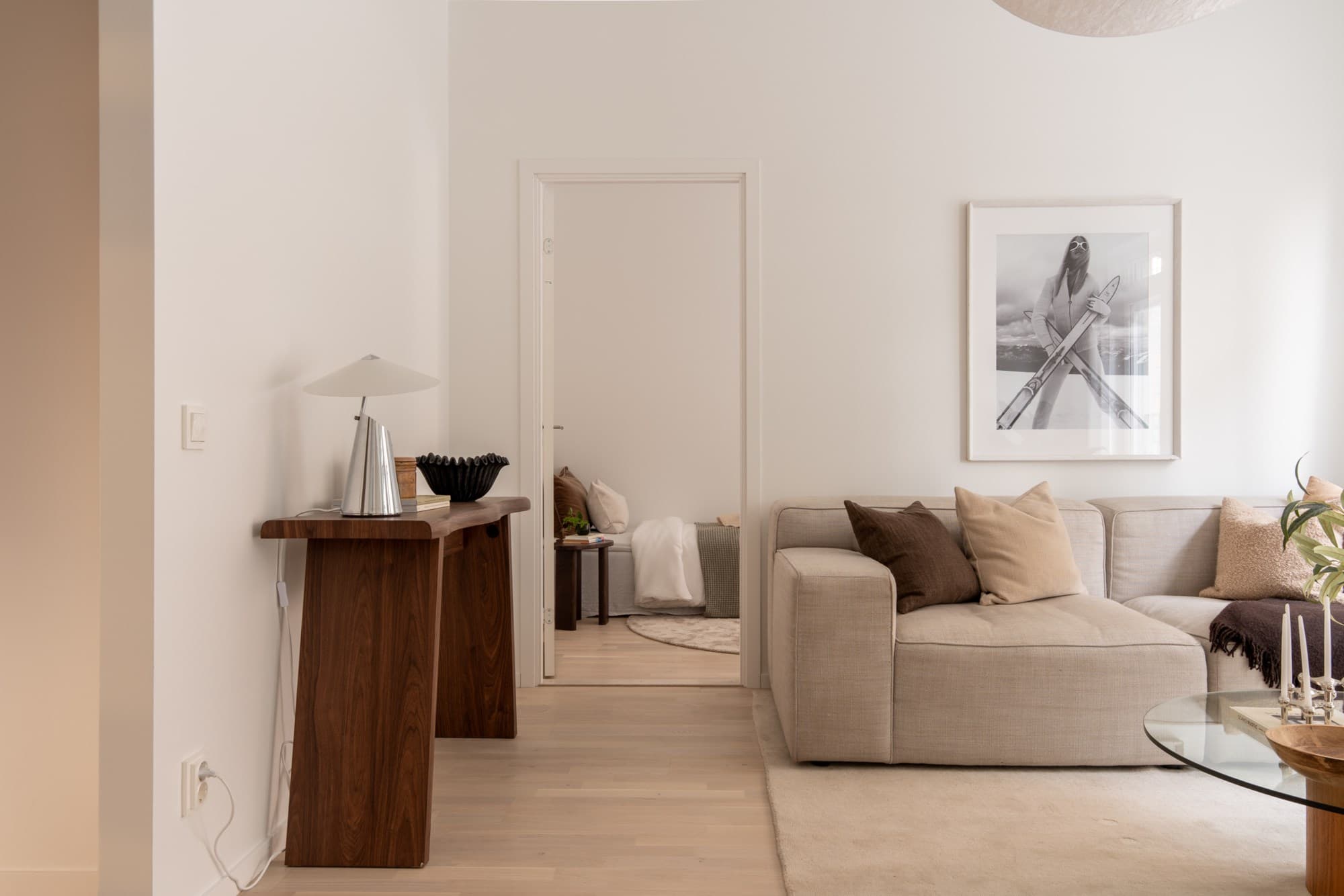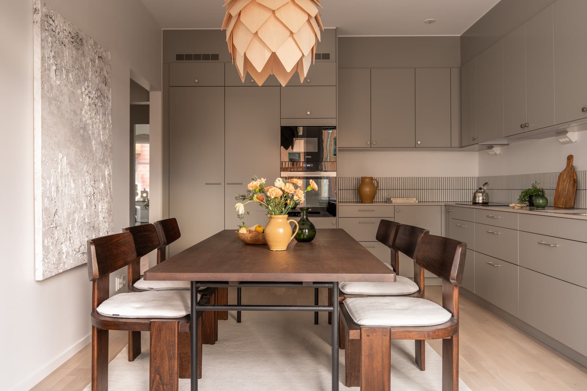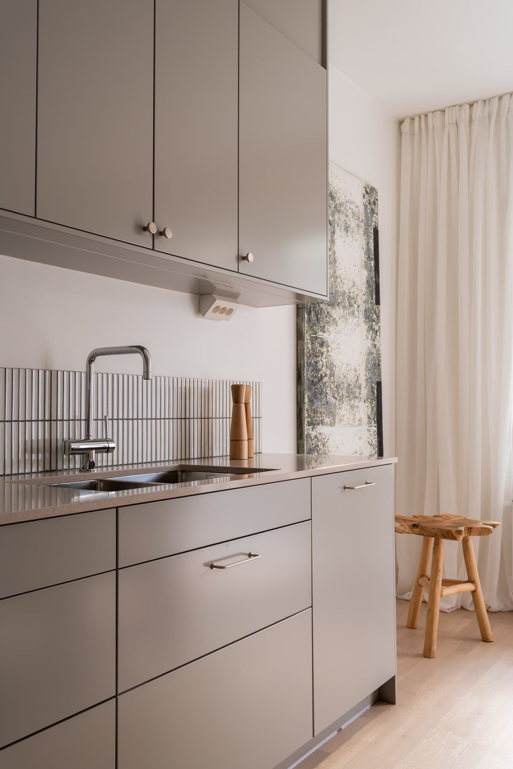 Lägenhetens genomtänkta inredning med ljus ekparkett och mjuk färgskala i gråa toner skapar ett harmoniskt intryck. Fina detaljer som kompositsten i köket och kolmårdsklinkers i badrummet ger karaktär.