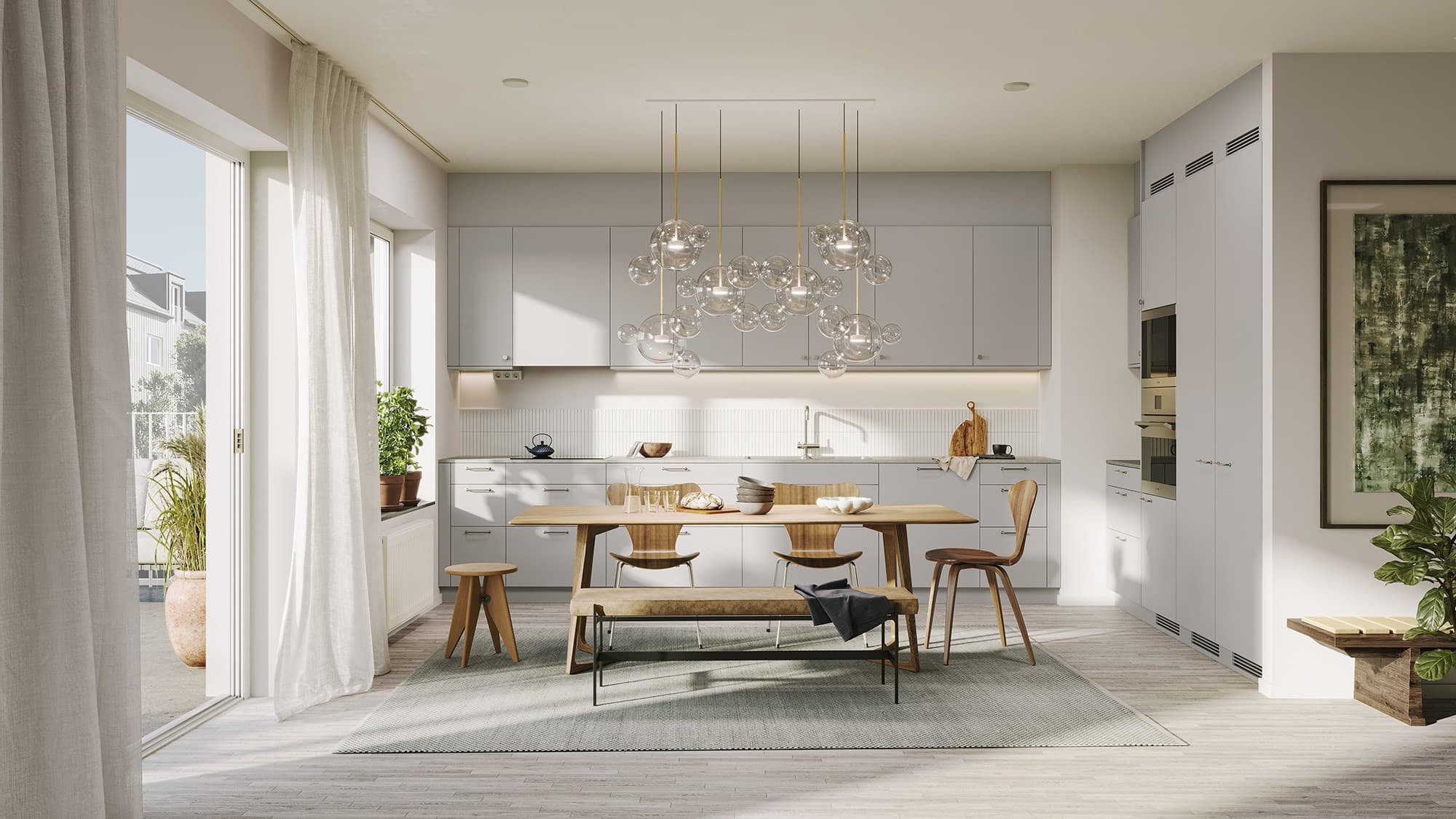 Lägenhetens genomtänkta inredning med ljus ekparkett och mjuk färgskala i gråa toner skapar ett harmoniskt intryck. Fina detaljer som kompositsten i köket och kolmårdsklinkers i badrummet ger karaktär.