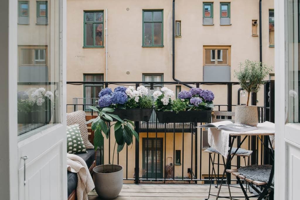 En stor balkong med ett lugnt och skönt gårdsläge. Här är det sol från ca 12-17 på sommaren. Du får plats med både stolar och ett bord på balkongen.