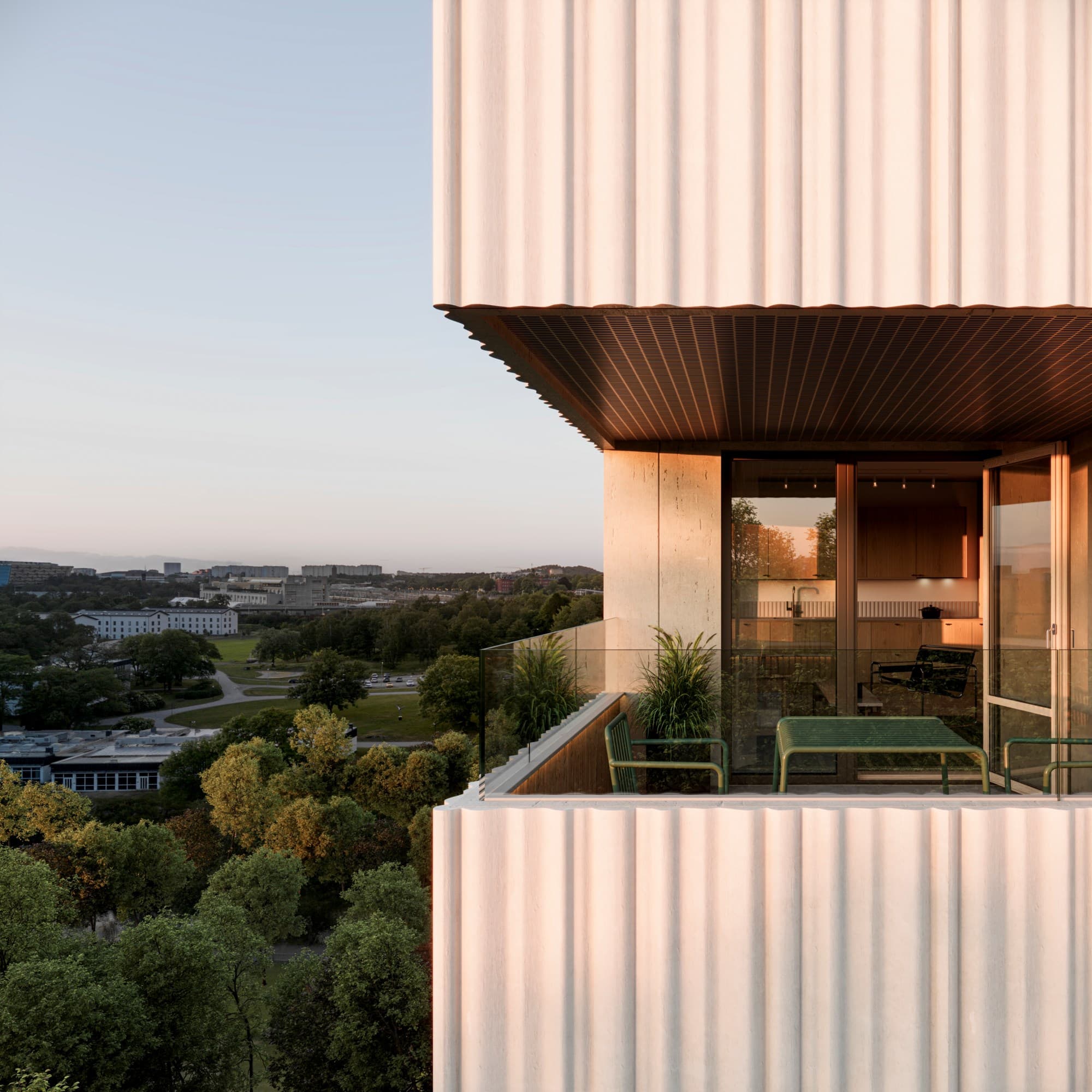 Trea om 71 kvm där arkitekturen står i centrum. Planlösningen är optimerad för funktion och kompletteras av genomtänkta materialval och design. Golven i ljus enstavig ek ramar in rummen med ett naturligt lugn. Väggarna är målade i vitt och i kök samt vardagsrum tillför den texturbehandlade betongen en subtil råhet som lyfter helheten.