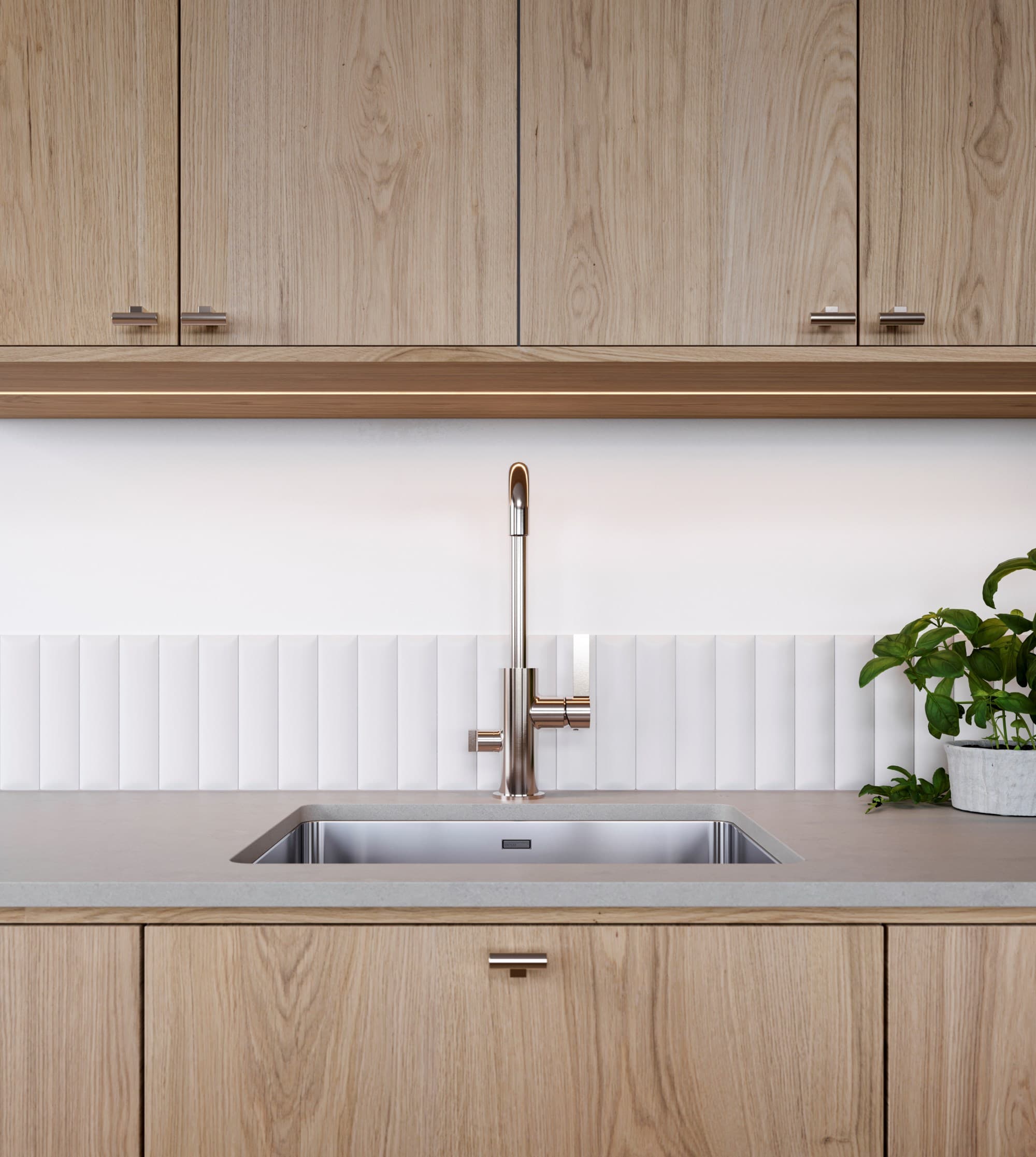 Köket från Vedum går i ljus ek med en stilren beigegrå bänkskiva och integrerade vitvaror från Siemens. Den öppna och sociala planlösningen skapar naturliga ytor för både matlagning och umgänge – perfekt för såväl vardagens middag som för trevliga kvällar med vänner.
