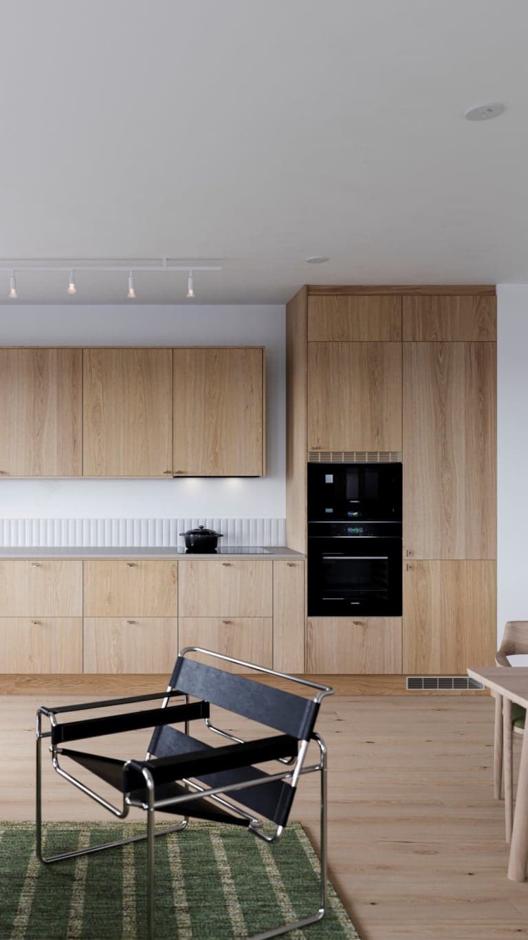 Trea om 71 kvm där arkitekturen står i centrum. Planlösningen är optimerad för funktion och kompletteras av genomtänkta materialval och design. Golven i ljus enstavig ek ramar in rummen med ett naturligt lugn. Väggarna är målade i vitt och i kök samt vardagsrum tillför den texturbehandlade betongen en subtil råhet som lyfter helheten.