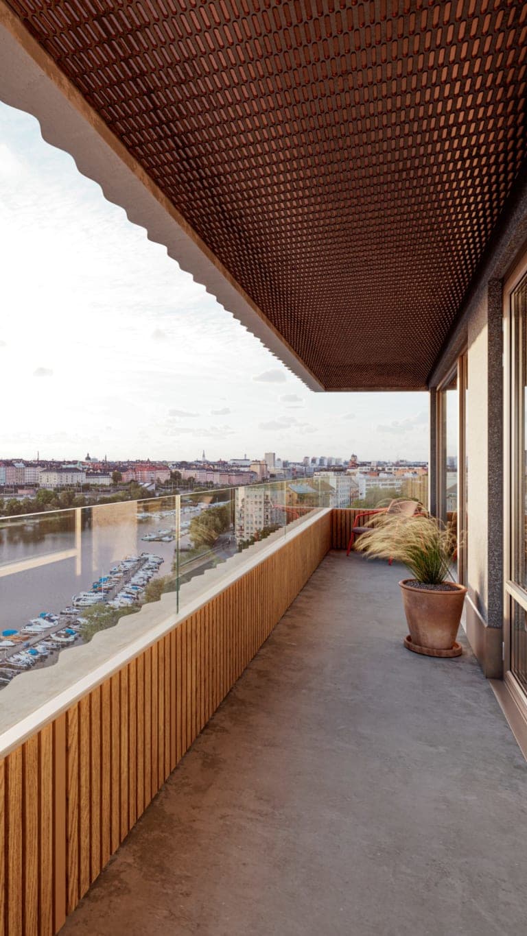 Två stora balkonger erbjuder hänförande utsikt över Karlbergssjön. Trädetaljerna bidrar till en varm och ombonad känsla och gör balkongerna till naturliga platser för avkoppling och umgänge. De generösa balkongerna ramas in av vackra trädetaljer och bjuder på utsikt över vatten och grönska, med stadens silhuett i fjärran.