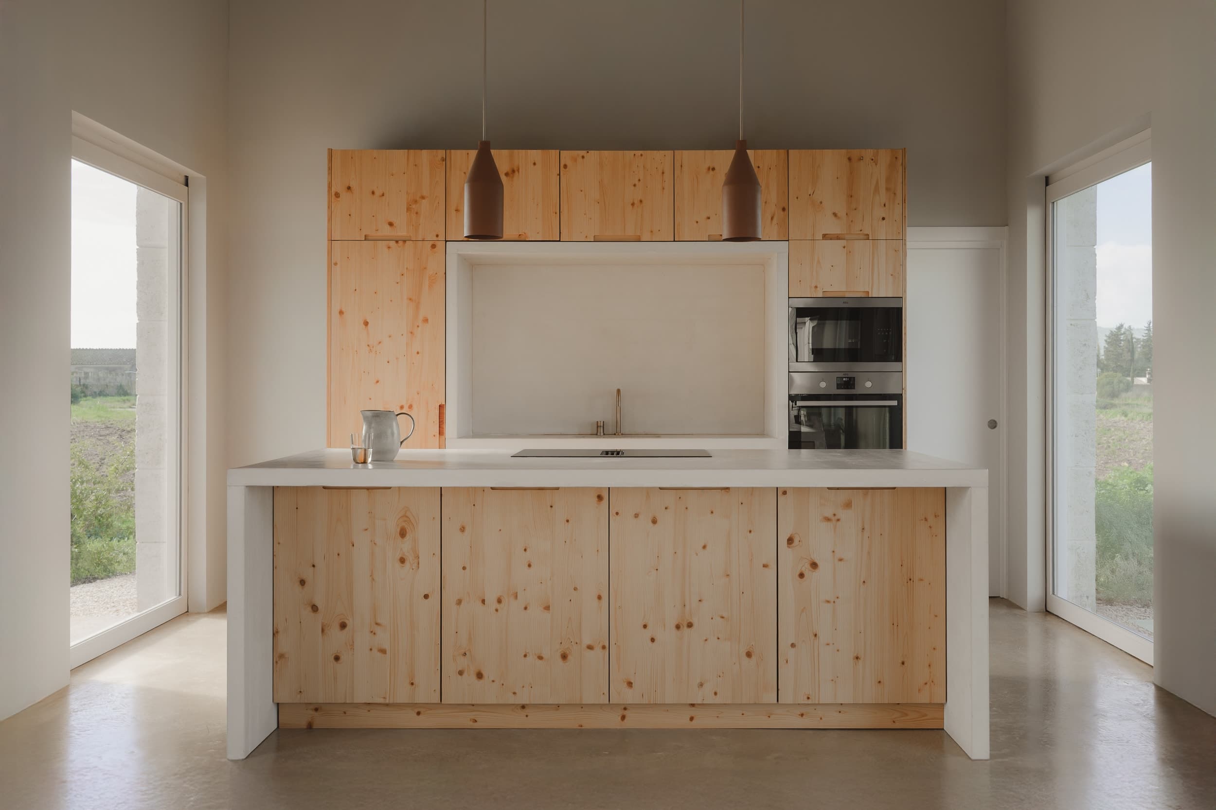 En el lado izquierdo de la planta, la vivienda se abre a un espacio diáfano de salón y comedor con cocina integrada. Grandes aperturas correderas conducen directamente a la terraza, permitiendo que la luz natural penetre profundamente en el interior y prolongando la vida diaria hacia el exterior. Los suelos de microcemento recorren toda la vivienda y se combinan con vigas de pino vistas. La cocina se concibe como un volumen de obra integrado, acabado en microcemento y revestido en madera de abeto, con zonas de servicio y un aseo de invitados situados de forma discreta. Desde el salón, un patio conduce a un atelier o estudio independiente, ligeramente separado para uso creativo o profesional.