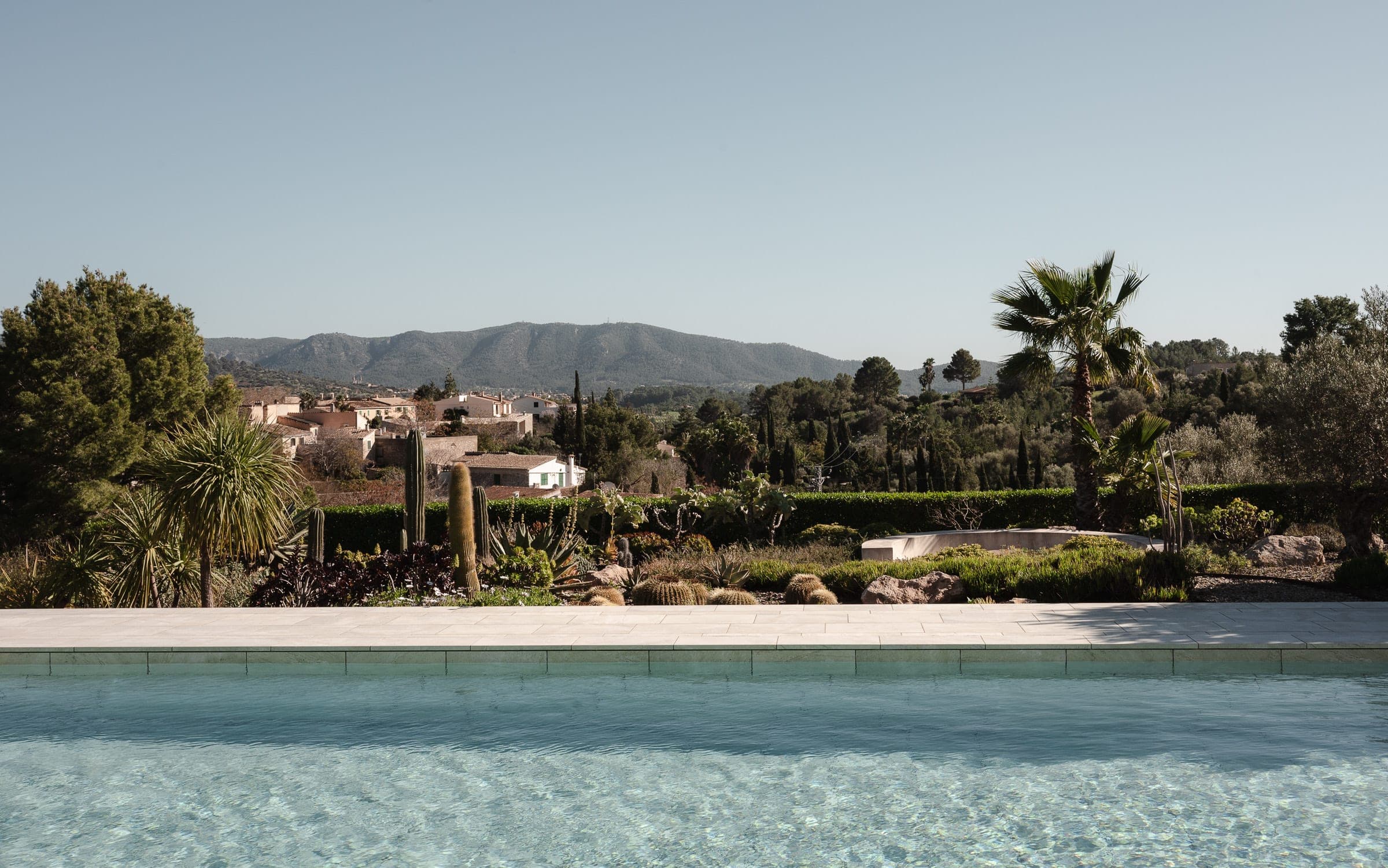 Los espacios exteriores prolongan de forma natural la vida interior. Una piscina de 60 m² se sitúa en una amplia terraza de piedra, rodeada por un jardín xerófilo con cactus, suculentas y vegetación mediterránea. Una zona circular de fuego con asientos y un comedor exterior cubierto crean espacios relajados para reuniones al aire libre con vistas abiertas al pueblo y las montañas.