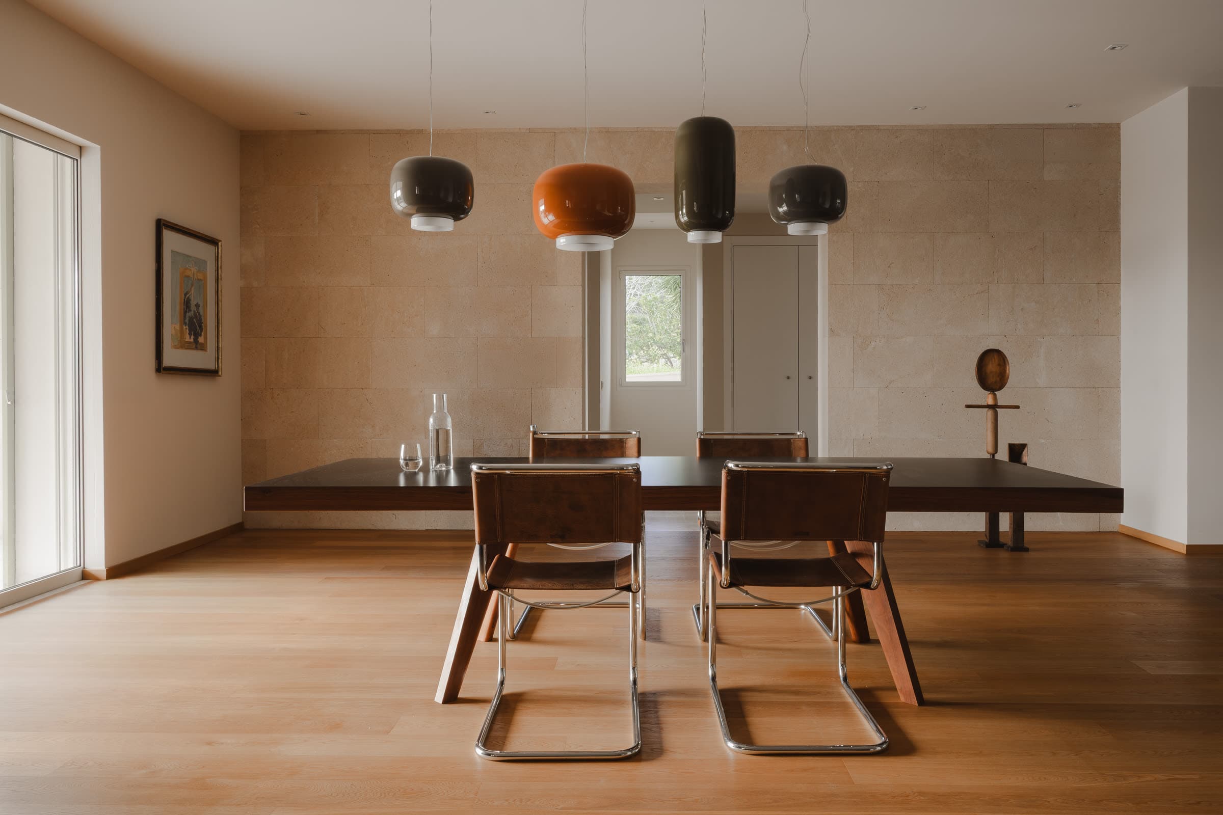En el centro se abre un amplio espacio de salón y comedor con cocina integrada. Los suelos de roble recorren toda la zona principal y se combinan con paredes de piedra natural, iluminación empotrada y una chimenea escultórica que define la zona de estar. La cocina a medida de Birgit Müller actúa como punto funcional del conjunto. Los armarios de roble y una isla de granito negro crean contraste con la paleta clara del interior. Está equipada con electrodomésticos de alta gama de Miele y Gaggenau, incluyendo dos lavavajillas y una placa de inducción extra ancha con controles metálicos. El comedor se sitúa bajo una serie de lámparas colgantes de tonos suaves y se abre mediante grandes puertas correderas a la terraza cubierta.