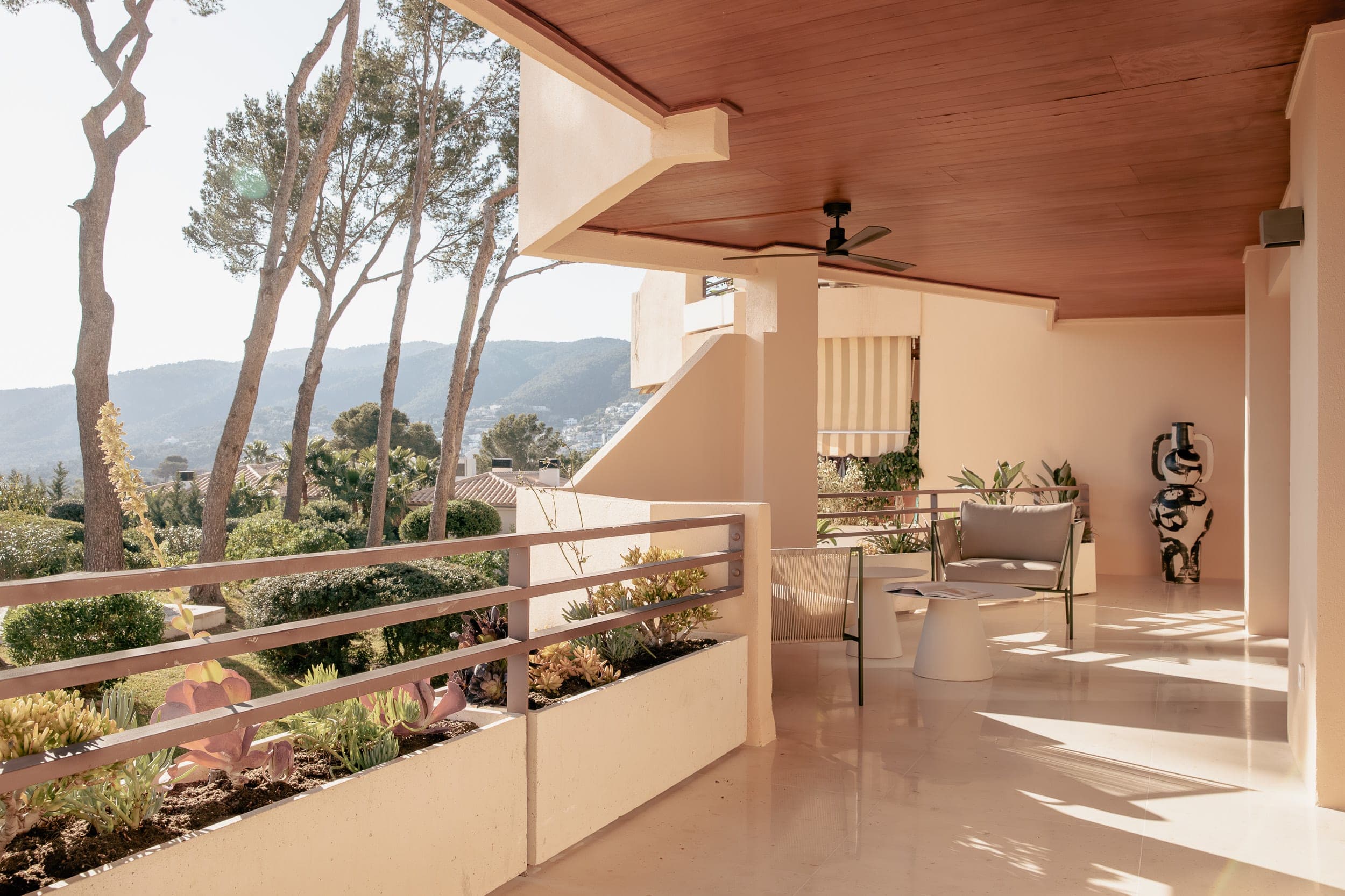Högt över Palma med utsikt över havet och det omgivande pinjelandskapet ligger denna generösa lägenhet i en byggnad från 1965, ritad av arkitekten Antonio Lamela Martínez, grundare av Estudio Lamela. Kontoret står bakom flera av Spaniens mest betydelsefulla moderna byggnader, däribland Torres Colón i Madrid, ombyggnaden av Santiago Bernabéu-stadion och Terminal 4 på Madrid-Barajas flygplats. Bostaden totalrenoverades 2025/2026 och förenar byggnadens modernistiska arkitektur med varma, samtida material. Interiören har utformats av studion Only&Co.