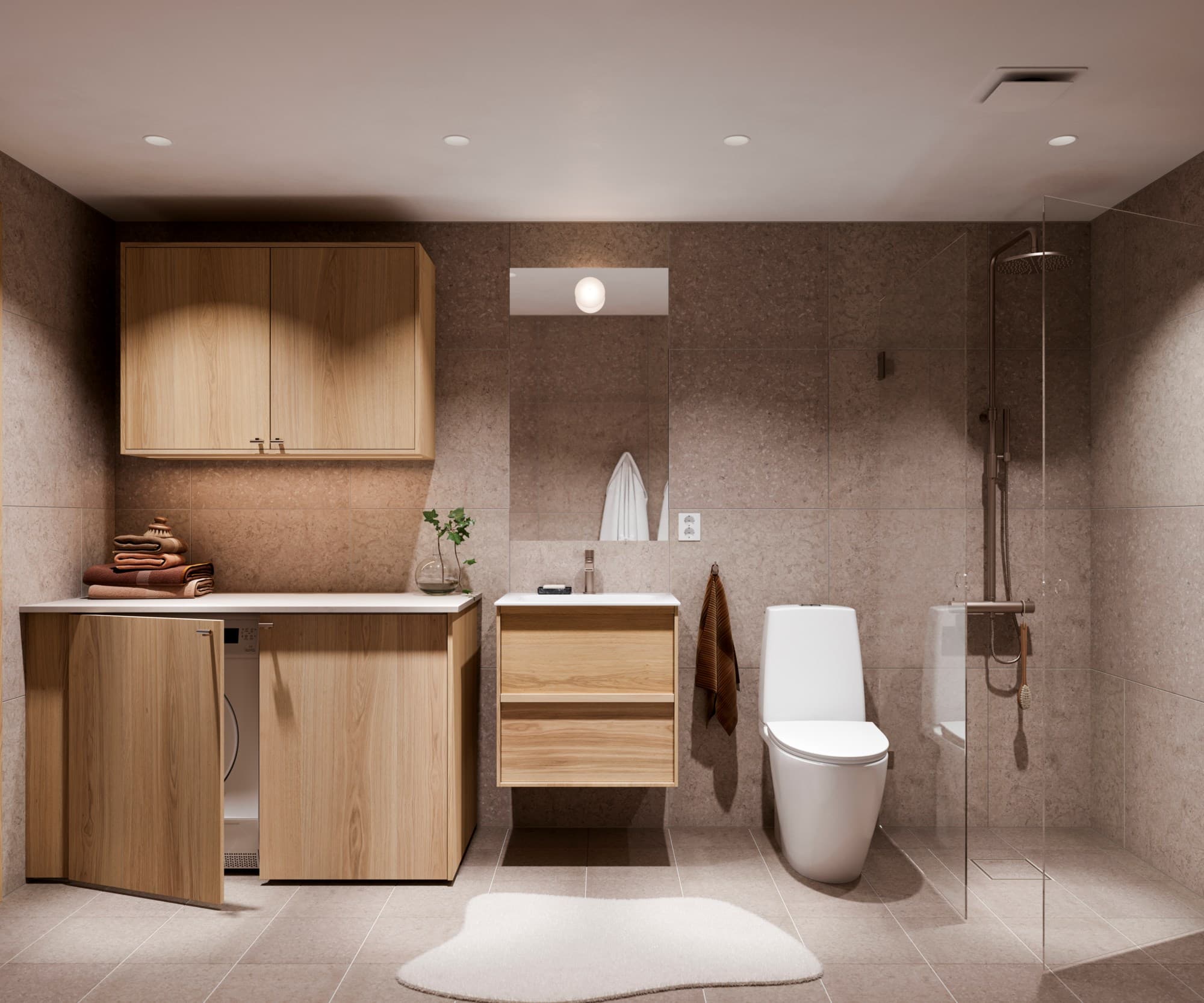 Badrummet följer samma genomgående känsla, med varmgrå klinker, spegel med kommod i ljus ek och vikbara duschväggar i klarglas. Tvättmaskin och torktumlare från Siemens är elegant integrerade under en bänkskiva som ger extra avställningsyta.